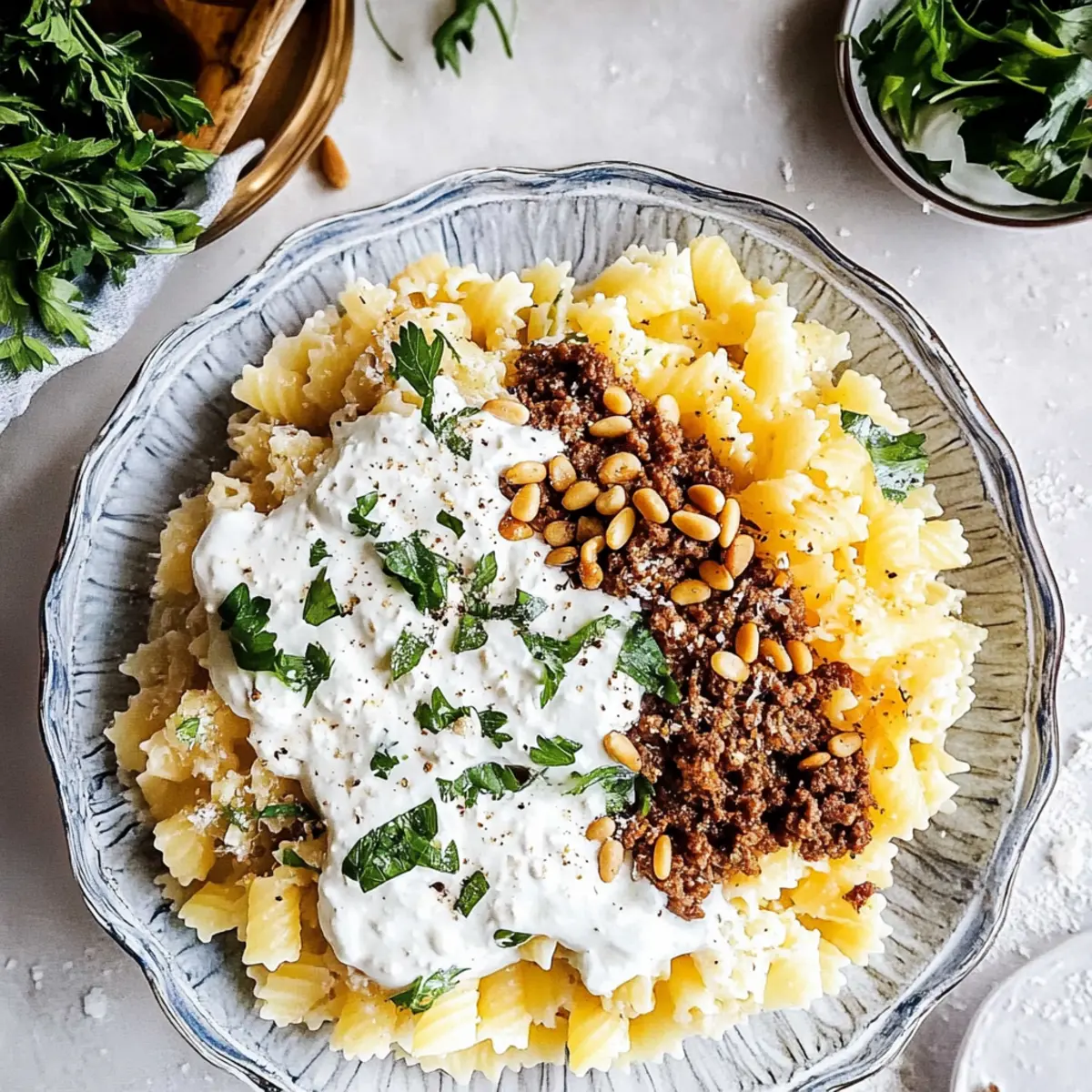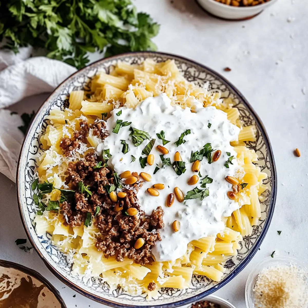 To serve, layer the cooked pasta at the bottom of a large serving bowl. Spoon over the beef mixture evenly, then generously drizzle the yogurt sauce on top. Finish by sprinkling the toasted pine nuts and any fresh herbs you desire, such as parsley or mint, for a final burst of flavor and freshness.