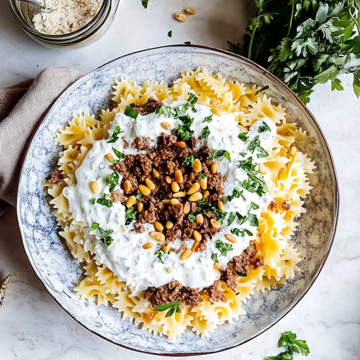 These Quick Arabic Pasta with Easy Yogurt Sauce are perfect for busy weeknights! You can prepare the meat mixture and yogurt sauce up to 3 days in advance. Simply cook the ground beef and let it cool before refrigerating it in an airtight container. The yogurt sauce can be mixed and stored in the fridge as well; just remember to stir it well before serving to maintain its creamy texture. When it’s time to enjoy your meal, cook the pasta fresh, layer it with the prepped components, and finish with toasted pine nuts and fresh herbs for a delightful, home-cooked dinner that tastes just as delicious as if made from scratch!