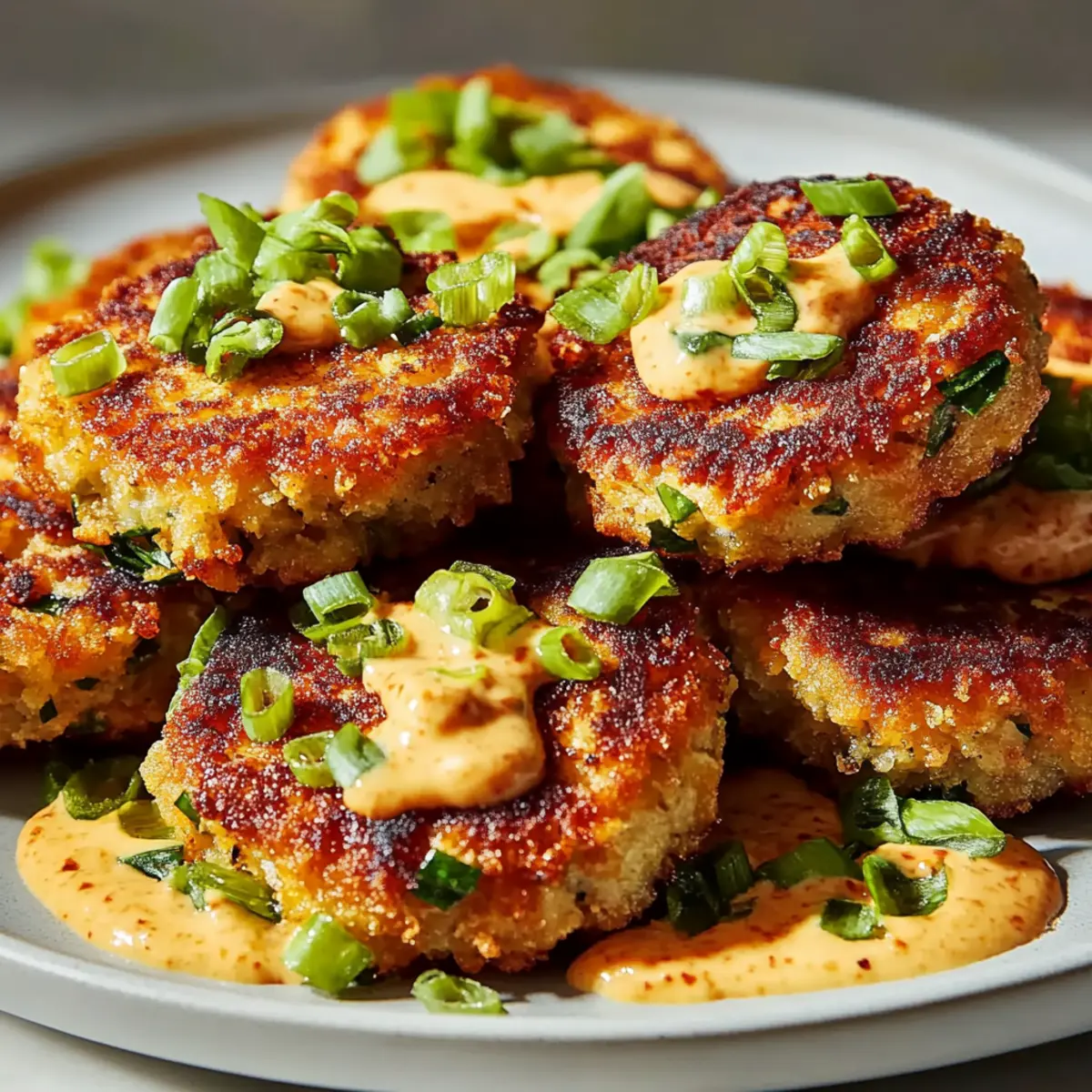 - Transfer the cakes to a plate lined with paper towels to absorb excess oil. Serve warm with the creamy sriracha aioli.