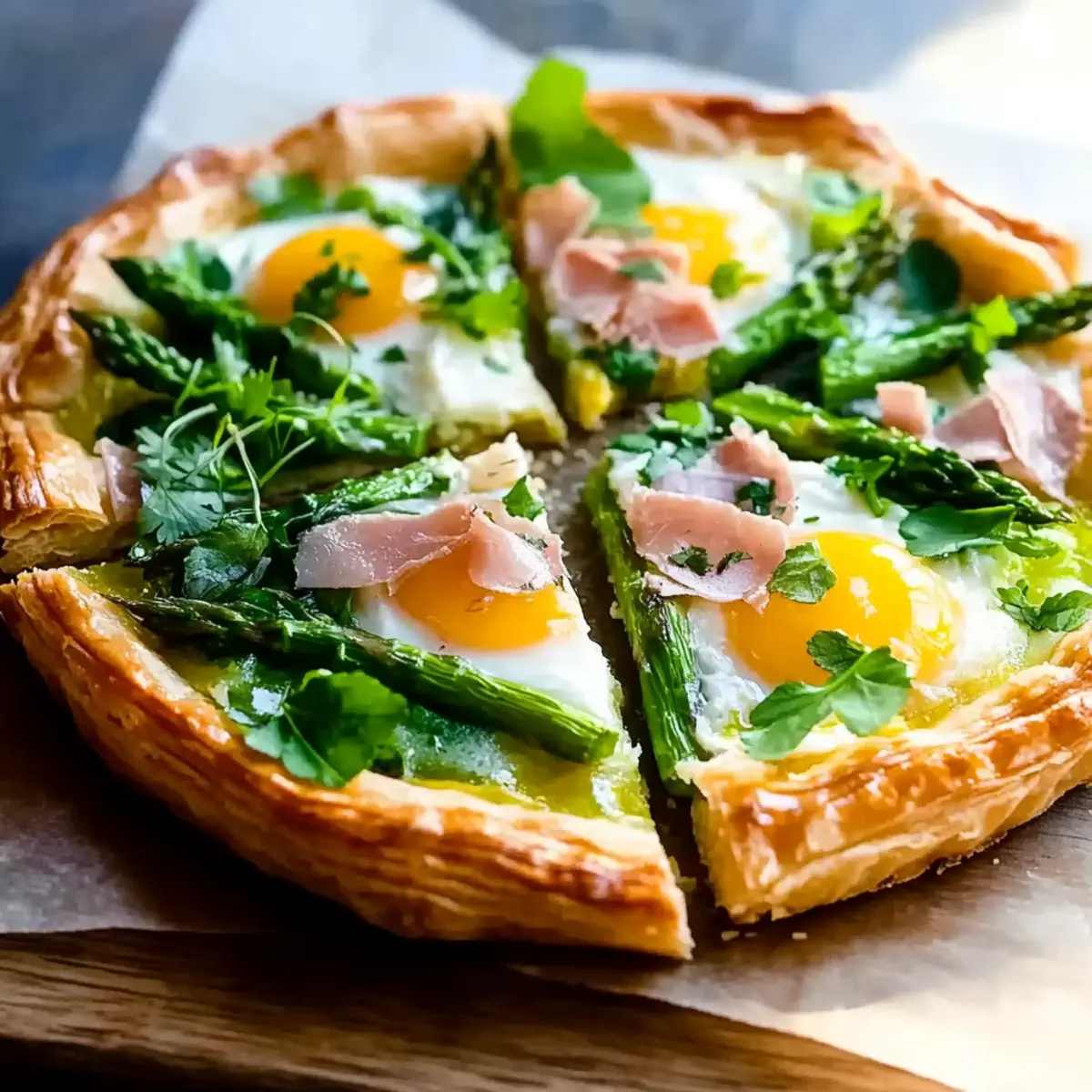 Once baked, remove the Asparagus Egg and Prosciutto Tart from the oven, and let it cool slightly on a wire rack for about 5 minutes. For an added touch, garnish with fresh herbs like chives or parsley, and zest some citrus over the top. This not only elevates the presentation but also enhances the flavors, giving a bright finish to your brunch centerpiece.