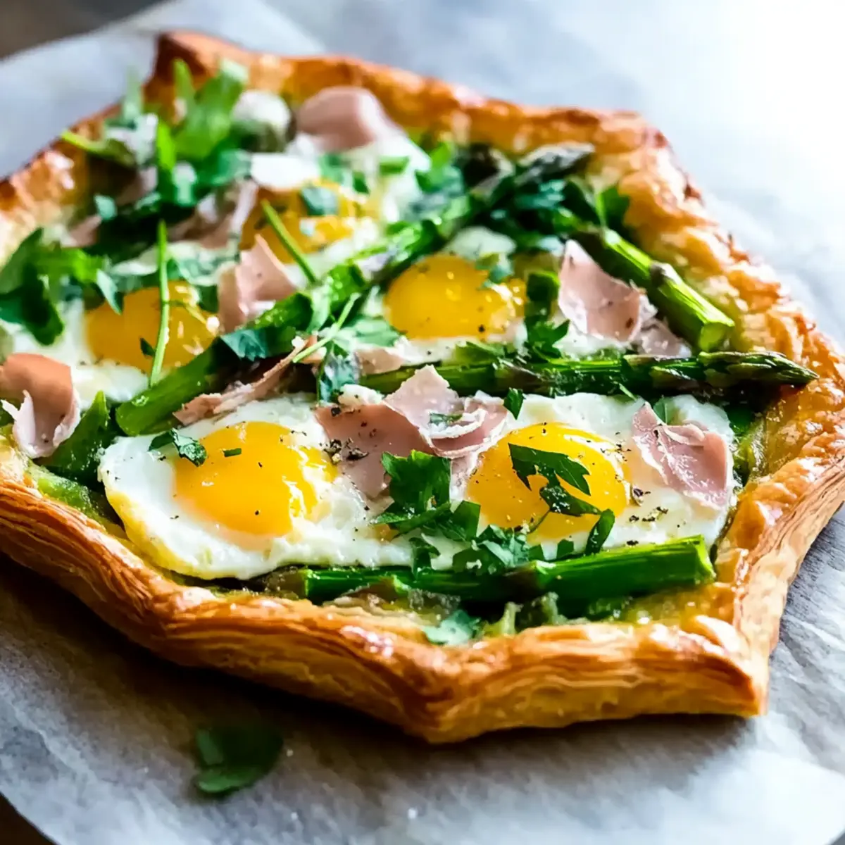 Simplicity in Preparation: This Asparagus Egg and Prosciutto Tart is a breeze to whip up, perfect for busy hosts.