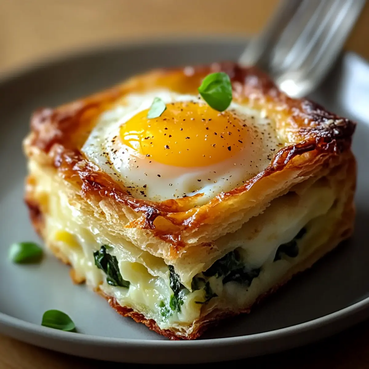 Spoon the creamy spinach mixture evenly into the baked pastry shells. Create a small well in the center of each filling and gently crack a large egg into each. Season the eggs with a sprinkle of salt and freshly ground black pepper. The Baked Eggs Napoleon is starting to take its delicious form!