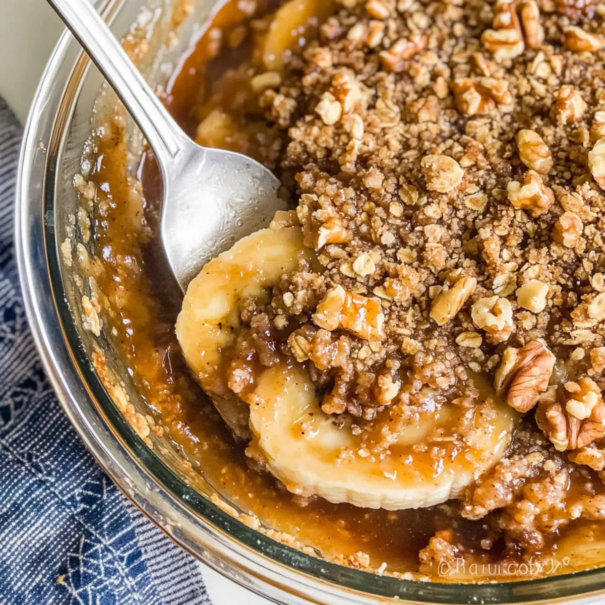 - Distribute the crisp topping evenly over the banana mixture, ensuring full coverage.