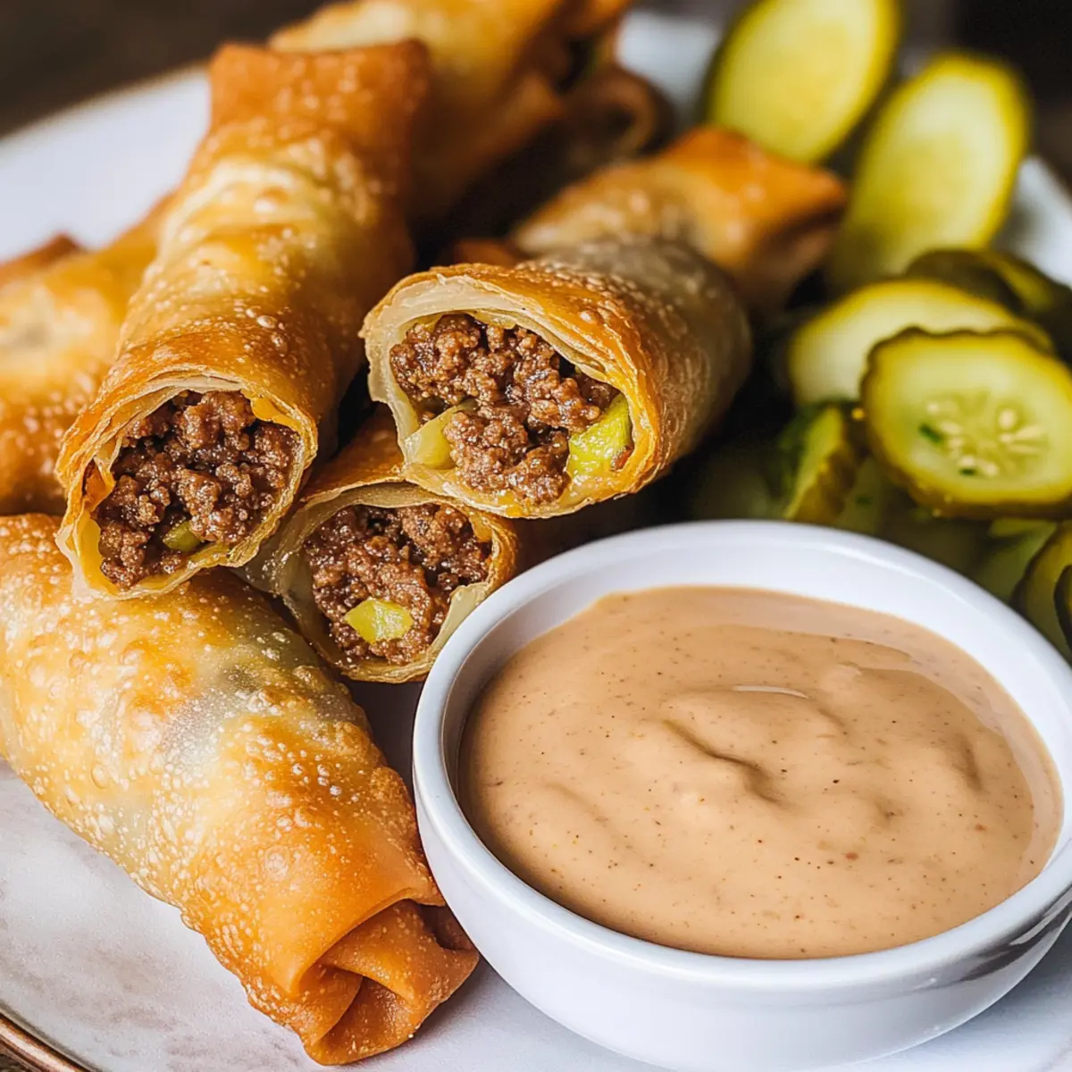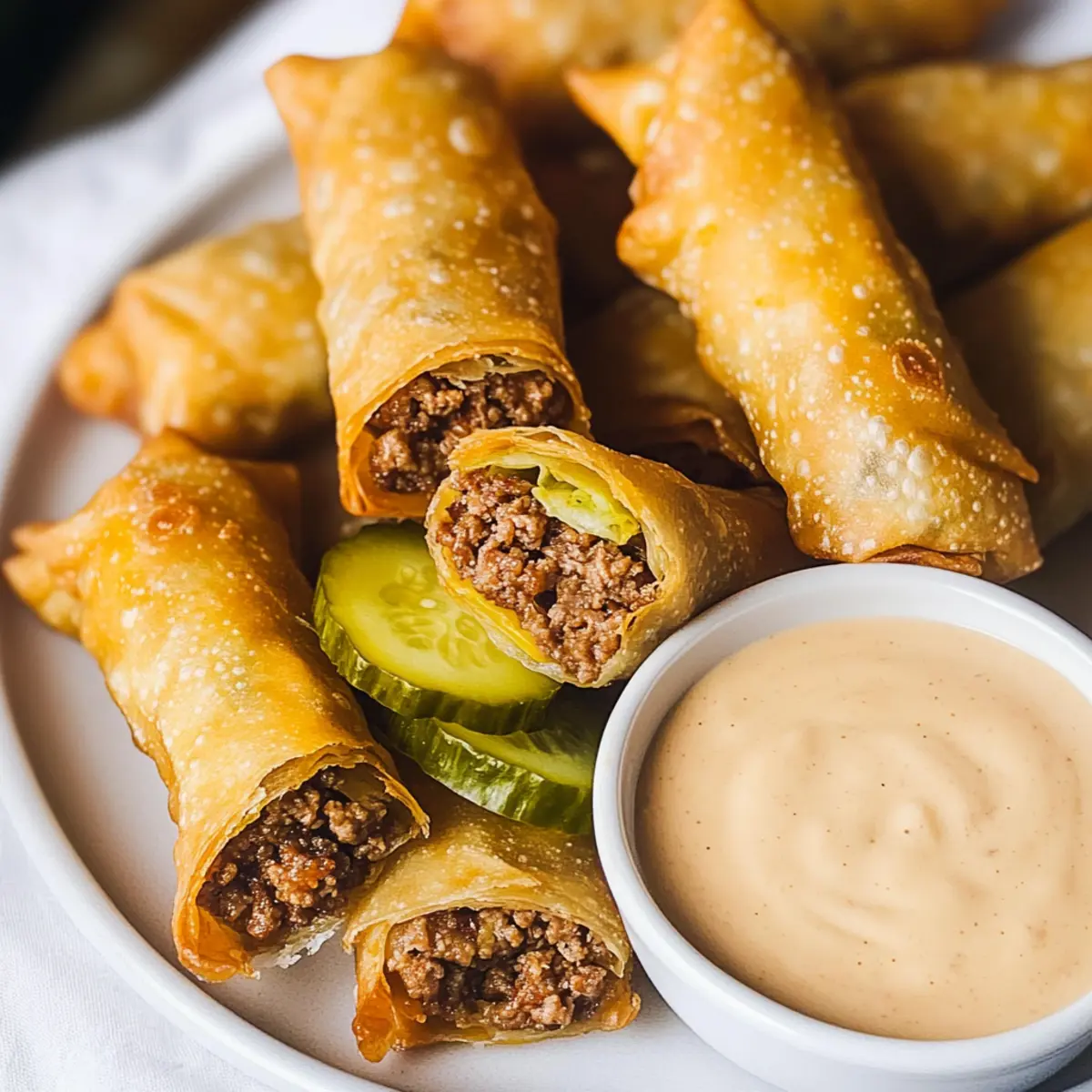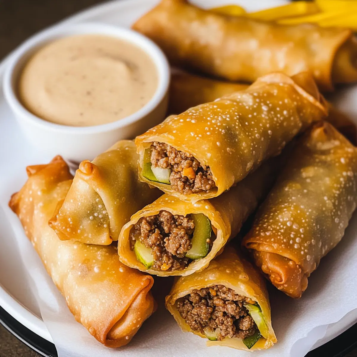 These Cheeseburger Egg Rolls are a fantastic meal prep option for busy weeknights! You can prepare the filling (ground beef, cheese, pickles, and spices) up to 3 days in advance; just store it in an airtight container in the refrigerator. When you’re ready to enjoy, simply fill the wrappers and fry them fresh for a crispy texture. Alternatively, you can assemble the egg rolls and freeze them for up to 24 hours before frying. For the best results, make sure to keep the egg rolls covered while they’re in the freezer to prevent freezer burn. Once fried, they’ll remain just as delicious and golden, ready to be paired with your creamy dipping sauce!
