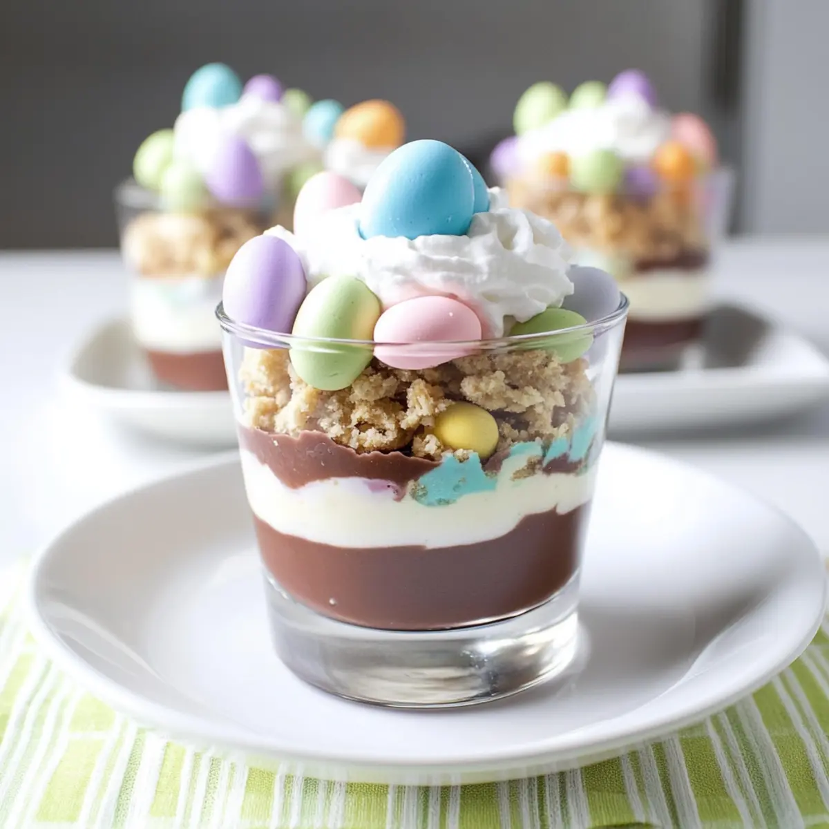 - Before serving, top each parfait with whipped topping, chocolate shavings, and mini eggs or candy sprinkles. Optionally add fresh berries.