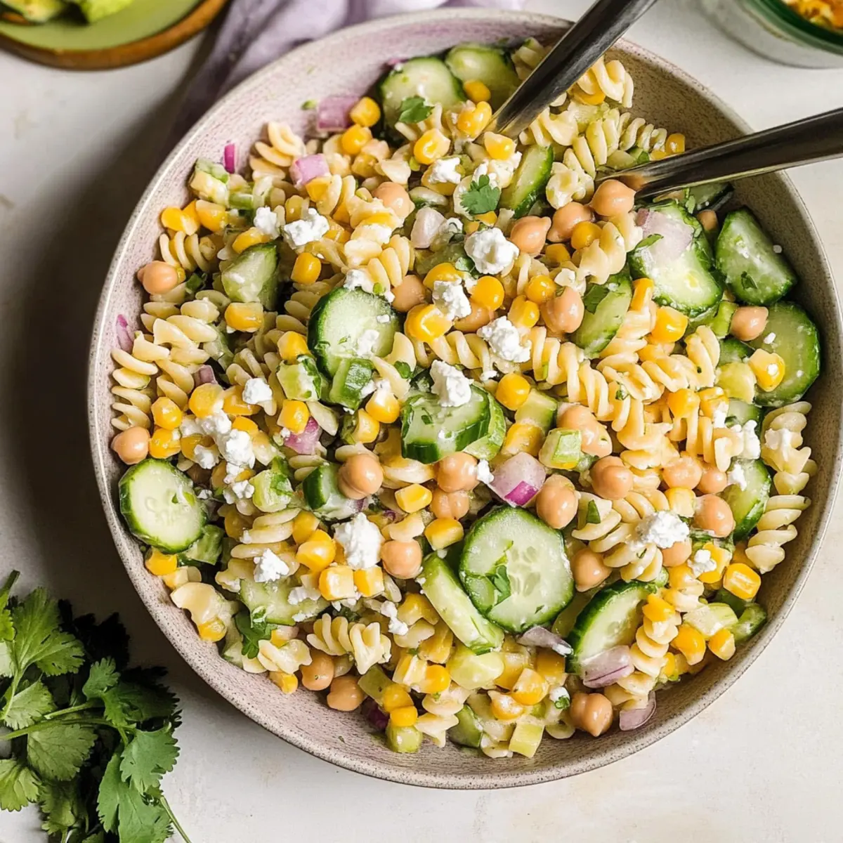 Preparing your Cilantro Lime Pasta Salad in advance is a fantastic way to save time on busy weeknights! You can cook the pasta and mix all the salad ingredients up to 3 days in advance. Just be sure to store the creamy cilantro lime dressing separately in an airtight container to maintain its freshness and creaminess. When you’re ready to serve, simply drizzle the dressing over the salad, toss gently, and garnish with feta cheese and cilantro. This way, you’ll enjoy a delightful meal without compromising on flavor or quality—perfect for grab-and-go lunches or refreshing summer picnics!