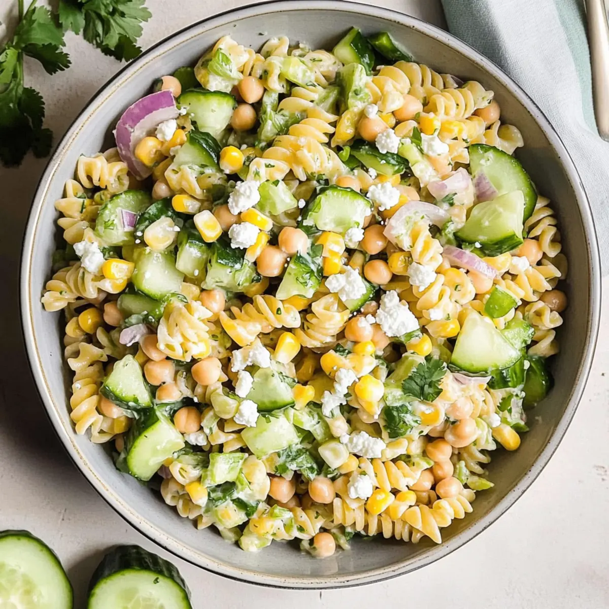 In a large mixing bowl, combine the cooled pasta with a 19 oz can of drained chickpeas, a 12 oz can of drained corn, and one chopped medium cucumber. Add a diced small red onion for sharpness, and gently fold the ingredients together, ensuring everything is mixed evenly without crushing the pasta.