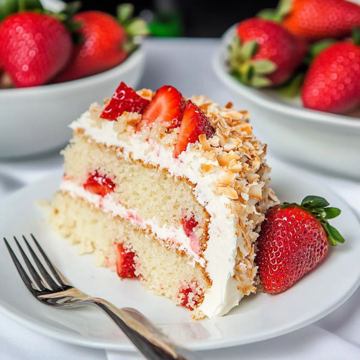 These Coconut Strawberry Cake components are perfect for busy home cooks looking to save time! You can bake the cake layers up to 3 days in advance. Allow them to cool completely before wrapping each layer tightly in plastic wrap and refrigerating. The frosting can also be prepared 24 hours in advance; store it in an airtight container in the refrigerator to maintain its creamy texture. When you’re ready to serve, simply assemble the chilled layers with the frosting and fresh strawberries—this gives you a stunning dessert that’s just as delicious as if made fresh! Enjoy the convenience and delight in the compliments you’ll receive without the last-minute stress.