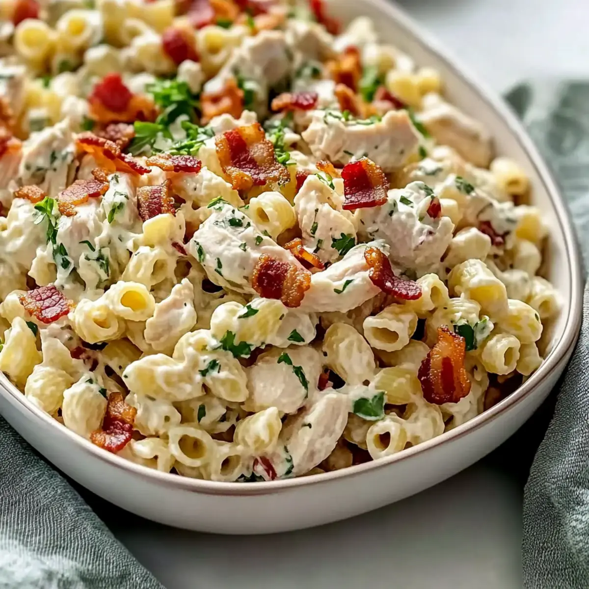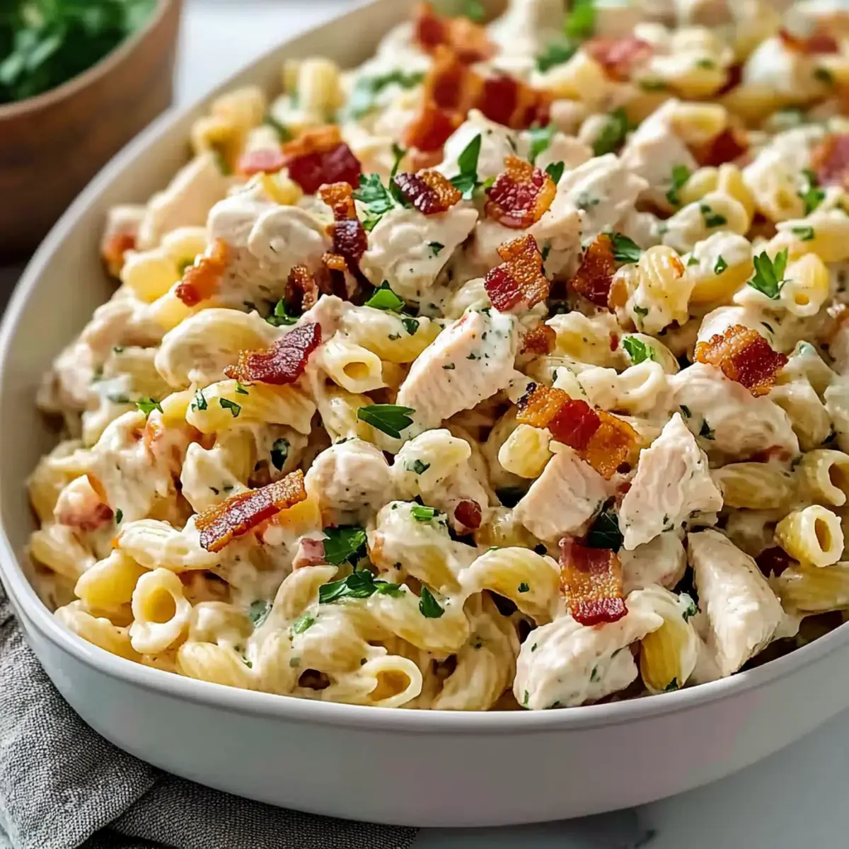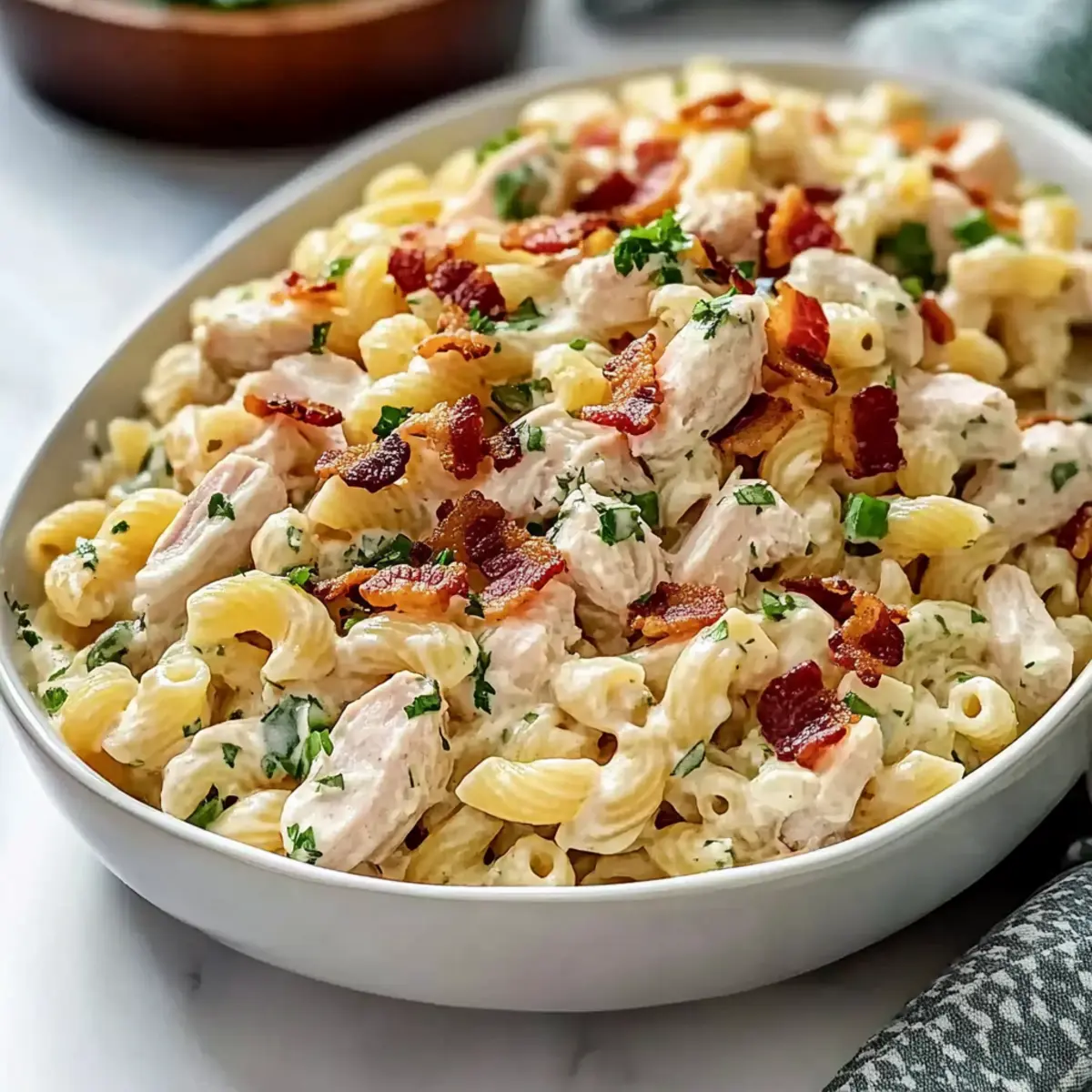 Just before serving, fold in the avocados gently to preserve their creaminess. Sprinkle the crumbled bacon on top for an extra crunch. Adjust seasoning if needed by adding a pinch more salt or pepper to enhance the flavors. Your creamy chicken pasta salad is now ready to impress!