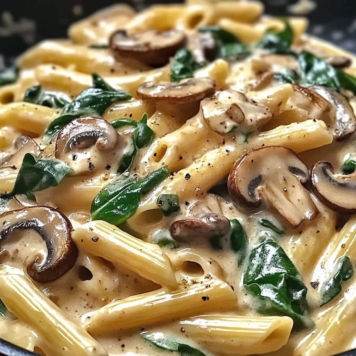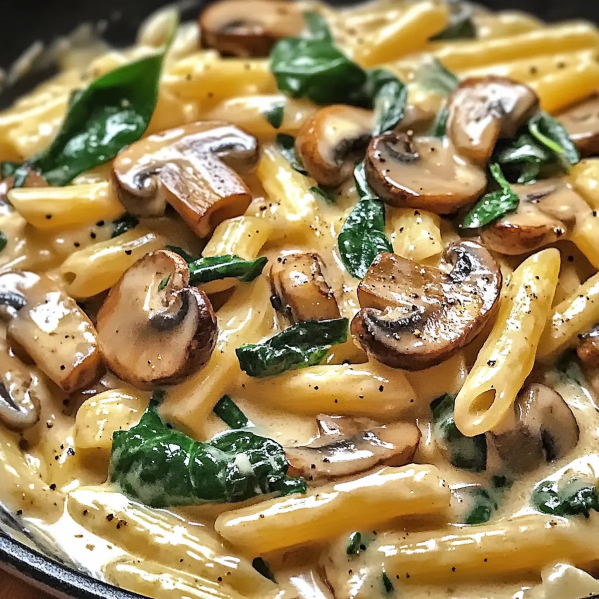 Once the mushrooms are browned, stir in 3 minced garlic cloves and continue cooking for about 1-2 minutes until fragrant. Then, add a generous handful of fresh spinach, cooking for another 2-3 minutes until the leaves wilt. The bright green spinach will add color and fresh flavor, making your pasta dish even more inviting.