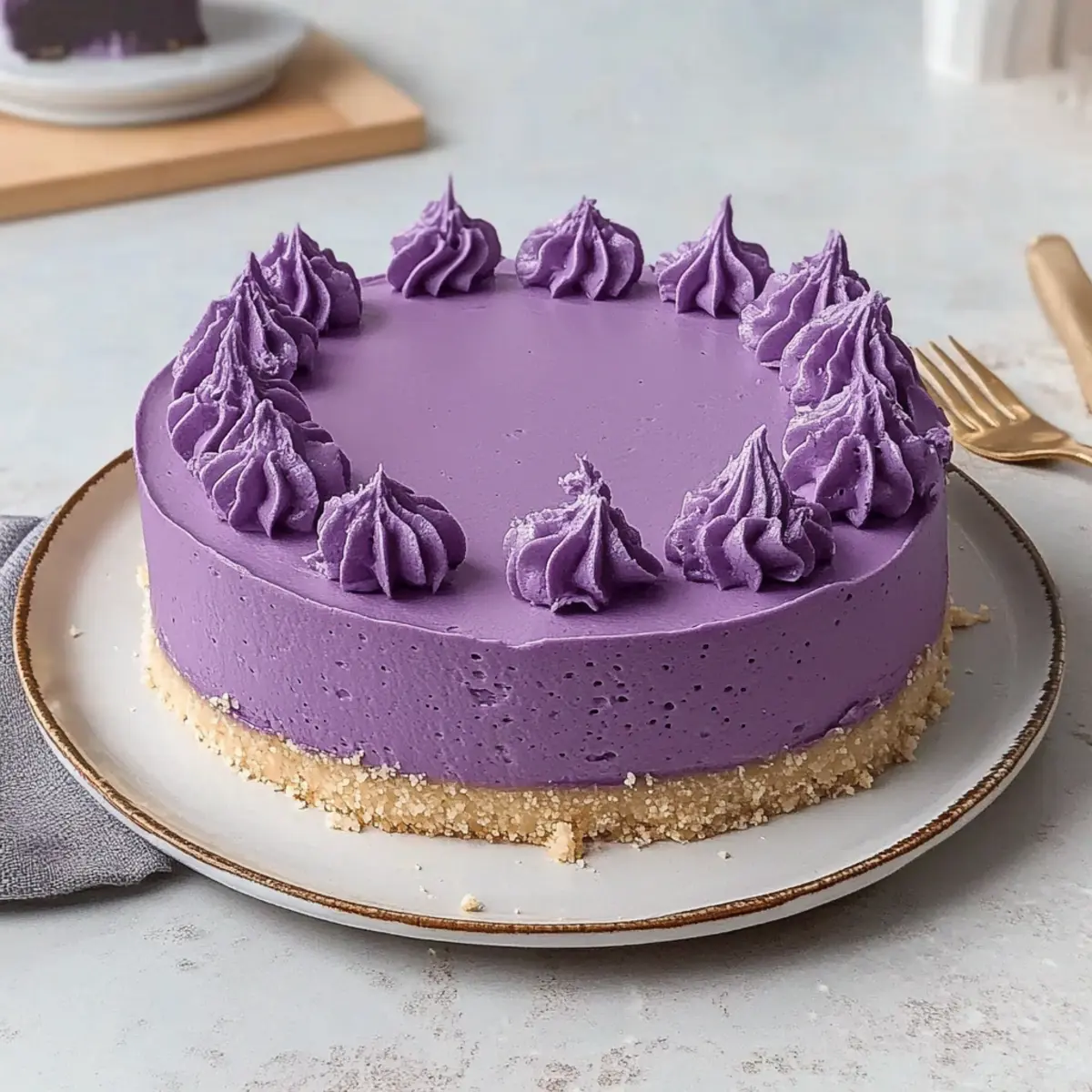 Visual Feast: The stunning purple hue of this cheesecake is sure to be a conversation starter and brighten up your dessert table.