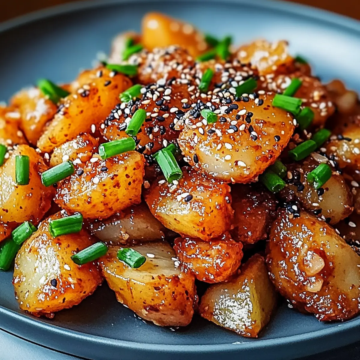 Finally, plate your crispy potatoes, generously drizzling them with the spicy gochujang dressing. For an Instagram-worthy finish, sprinkle fresh chives and toasted black sesame seeds over the top. Reserve any remaining dressing on the side for those who want an extra kick. Then, prepare to savor the deliciousness of your homemade Crispy Korean Potato Dish!