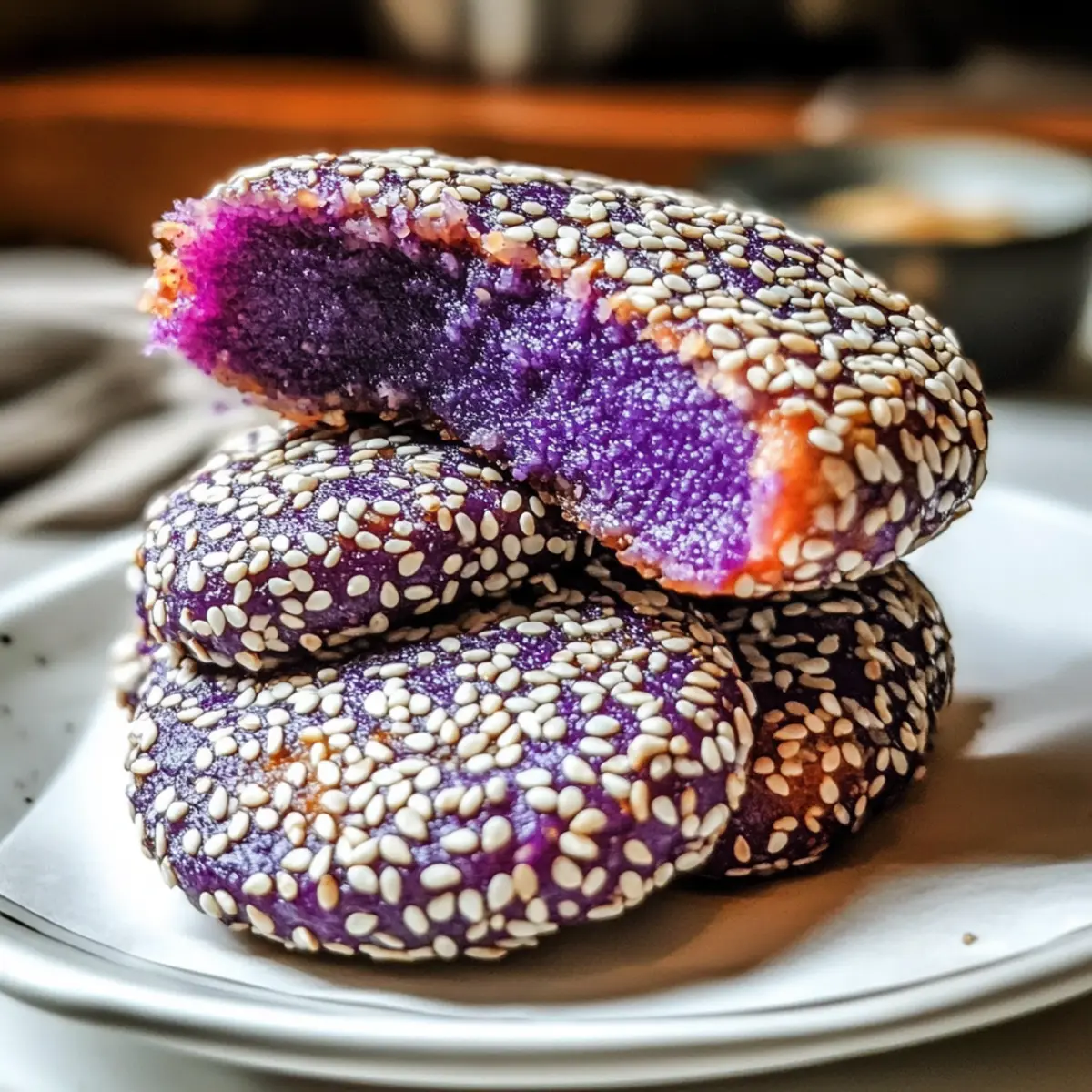 Once your dough is ready, turn it out onto a clean surface and shape it into small, flat cakes about ½ inch thick. For added texture and flavor, roll each cake in white sesame seeds, ensuring they are evenly coated. Place them on a tray while you heat the skillet, ready to cook your vibrant Crispy Purple Sweet Potato Cakes.
