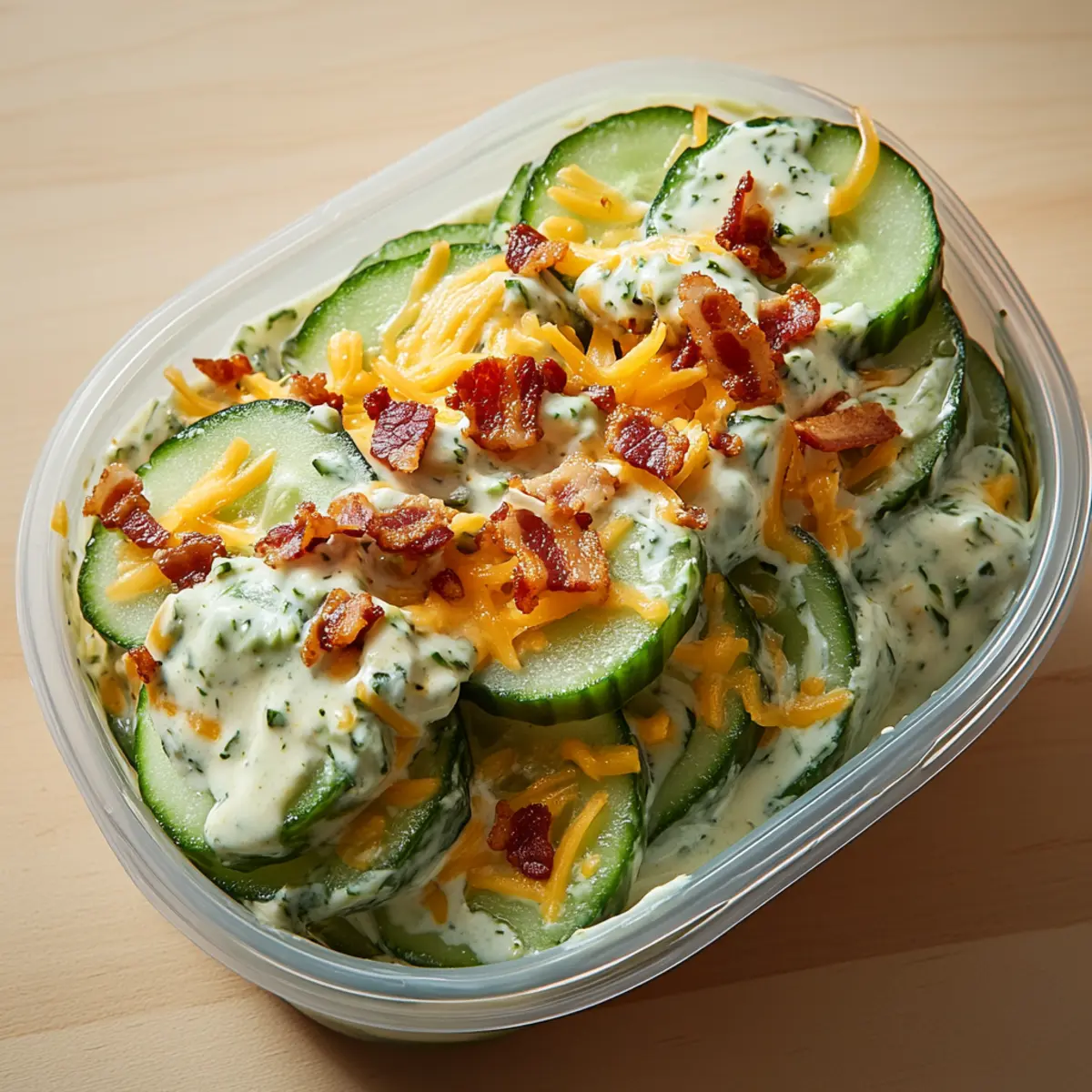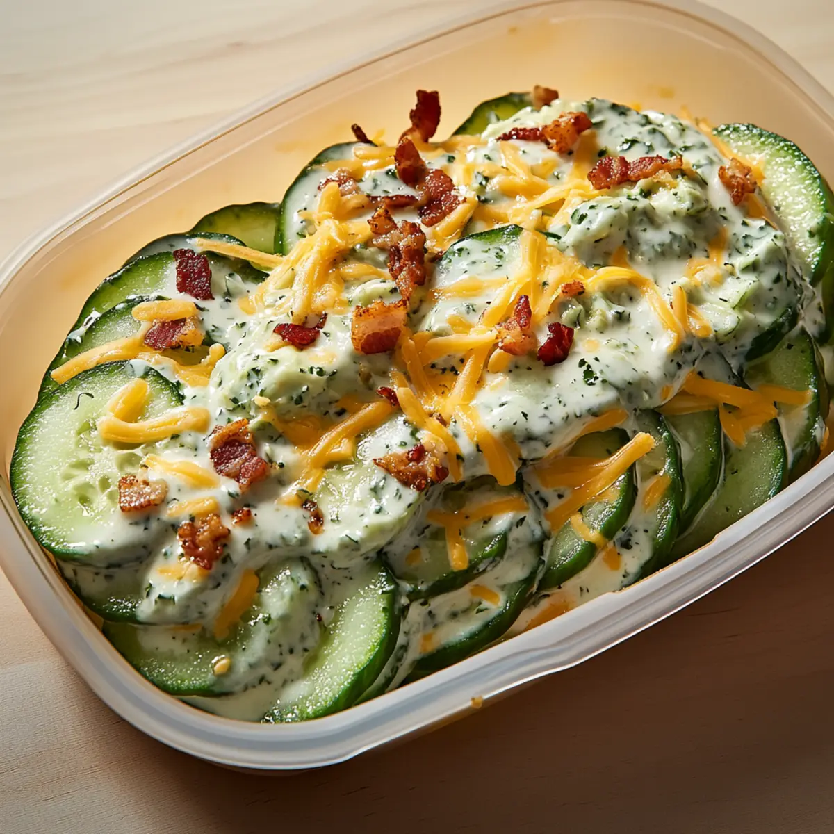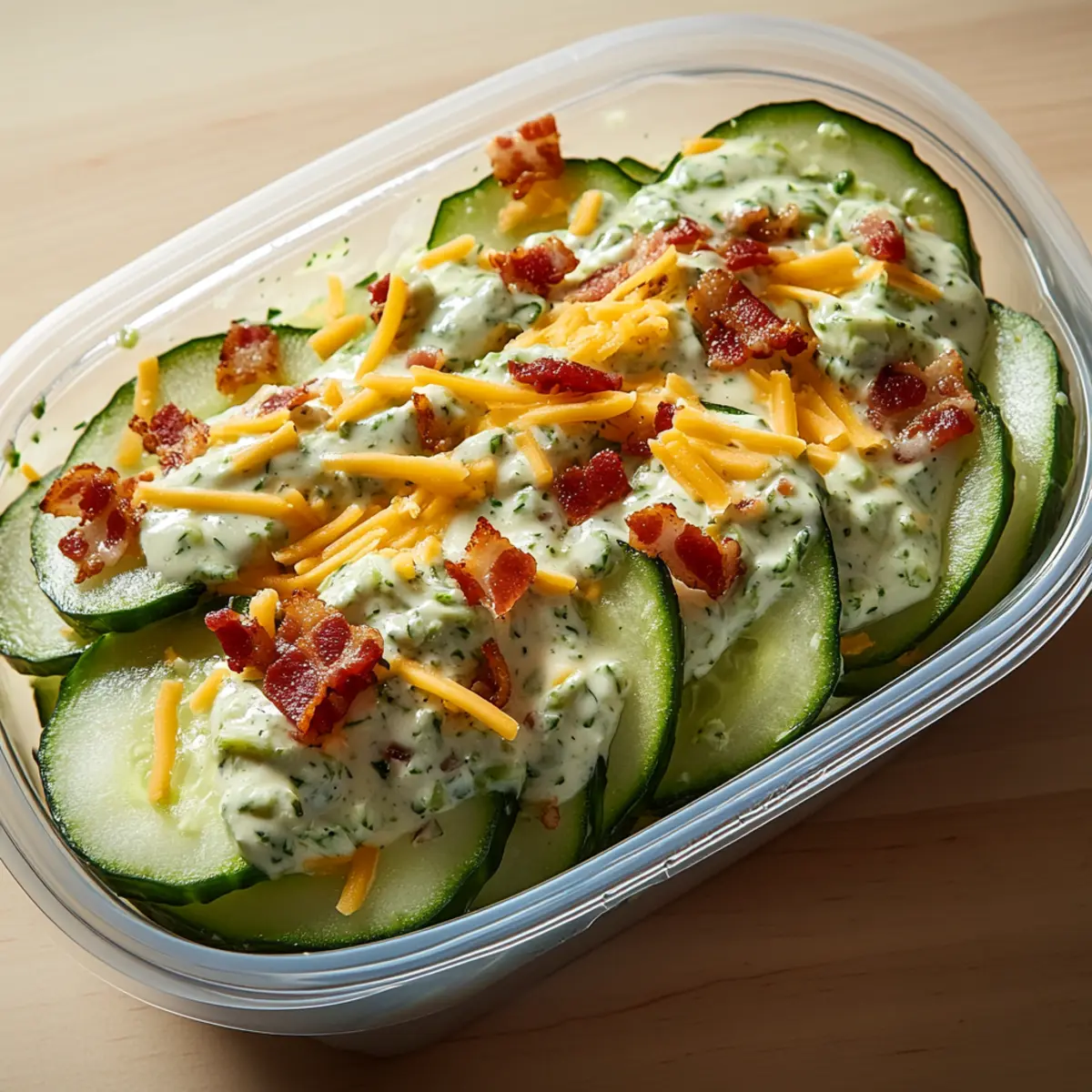 Bacon Alternatives: Replace bacon bits with smoked salmon or grilled chicken for a heartier, protein-packed option. The savory nature of smoked salmon beautifully complements the cucumber’s freshness.