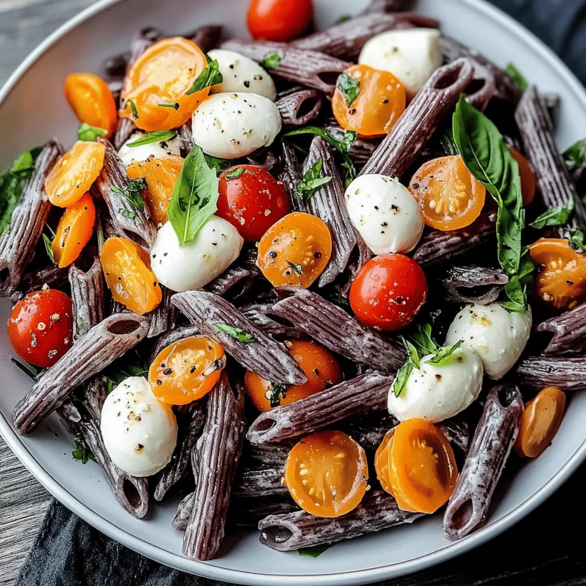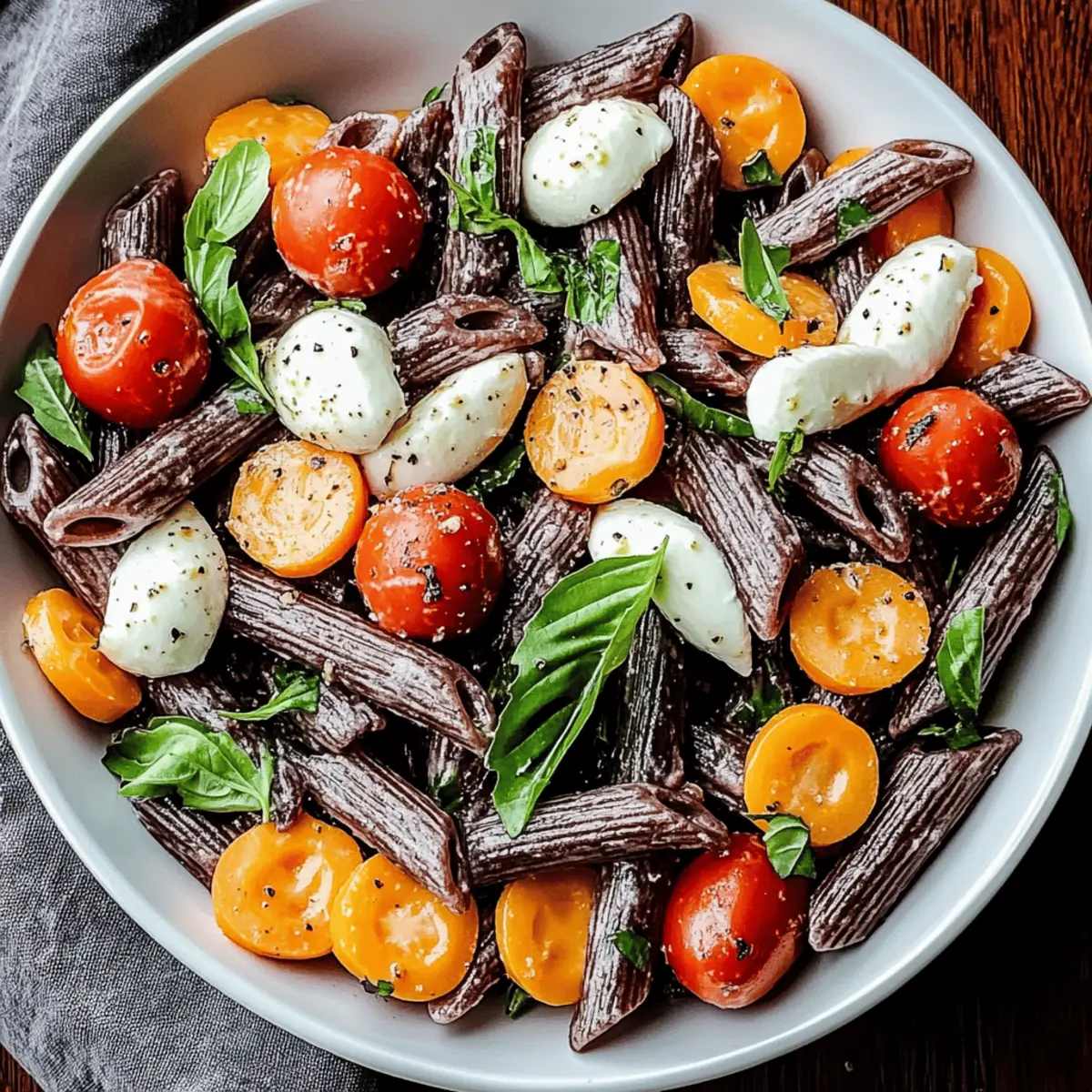 Begin by bringing a large pot of salted water to a boil over high heat. Once boiling, add the black penne and cook for about 10 minutes, or until al dente—tender yet firm to the bite. Drain the pasta in a colander and rinse it under cold water to stop the cooking process, ensuring it retains its vibrant color for the Delicious Halloween Caprese Pasta Salad.