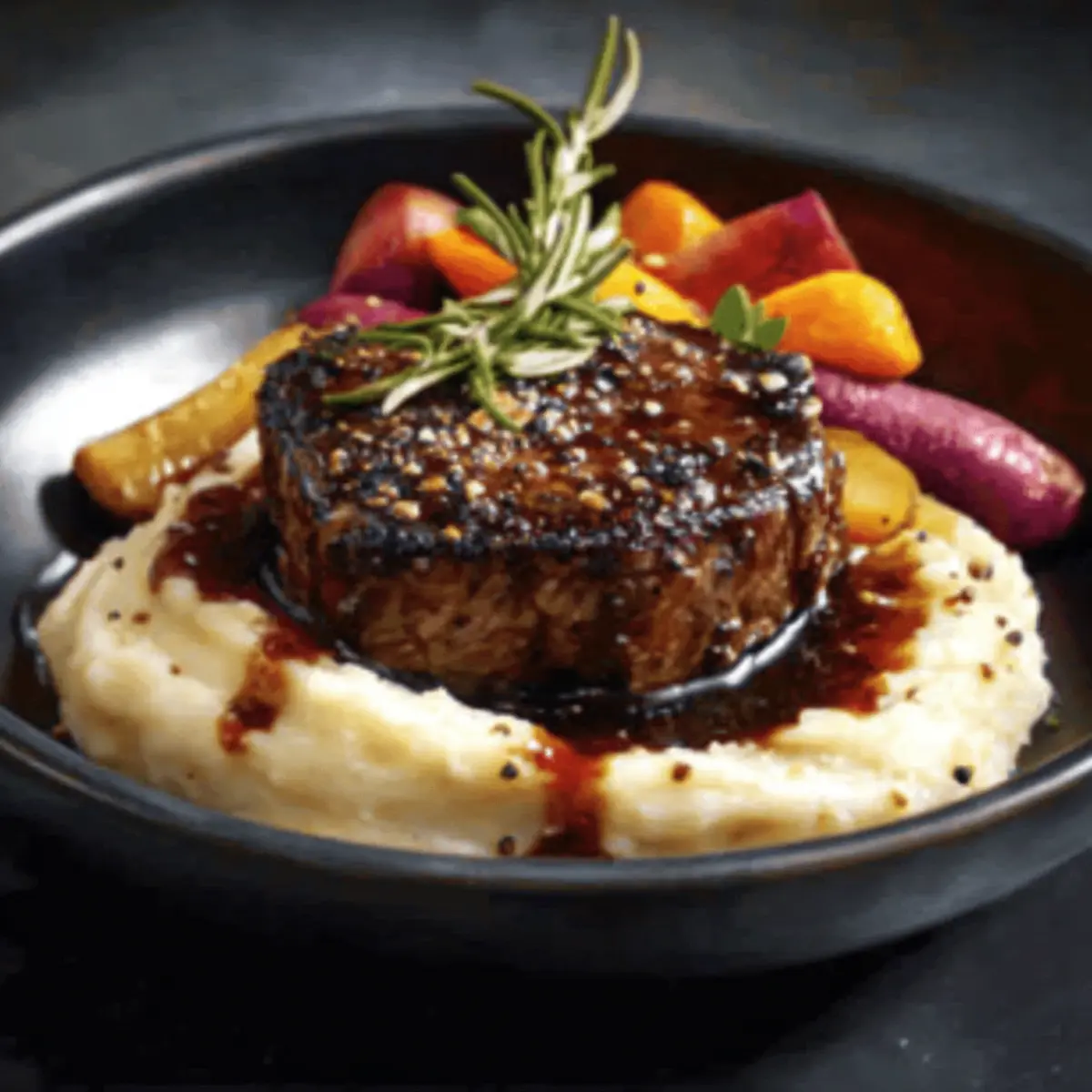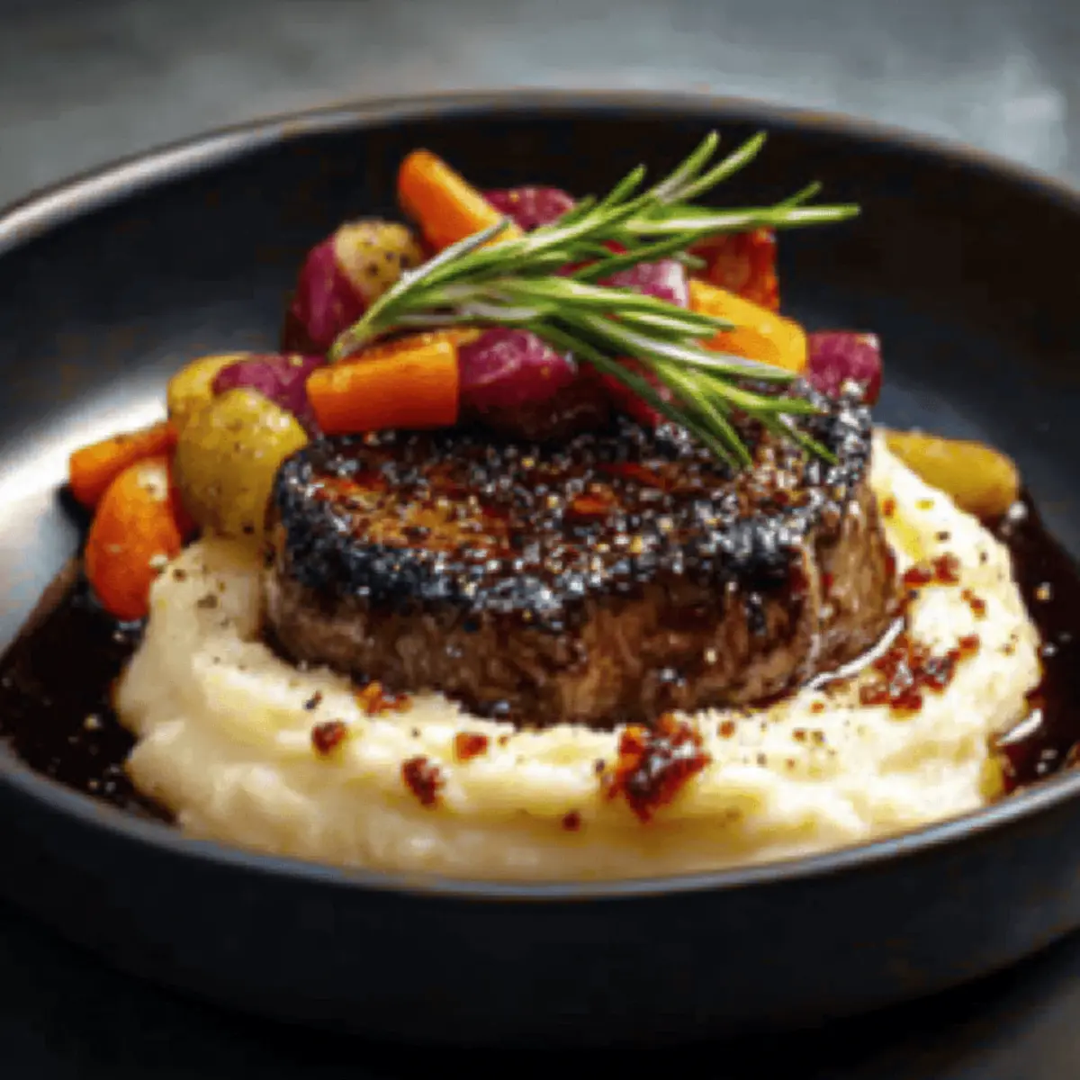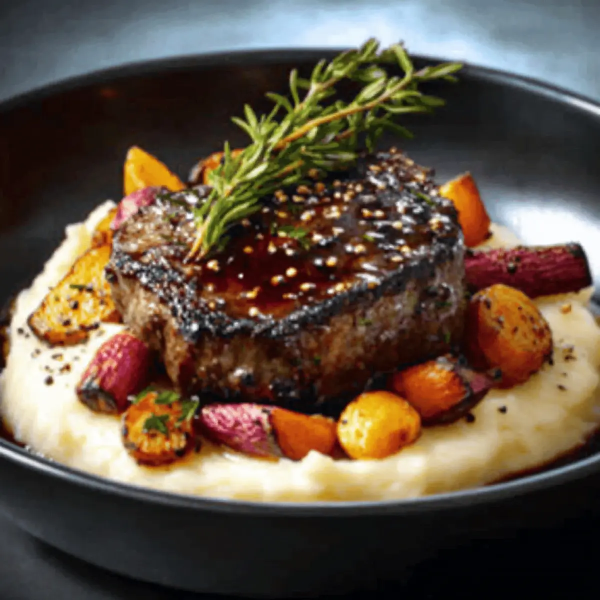 - On warm plates, create a bed of creamy mashed potatoes. Slice the rested filet mignon and place it atop the mashed potatoes. Generously arrange the roasted root vegetables around the steak. Drizzle the red wine reduction over the steak and potatoes.
