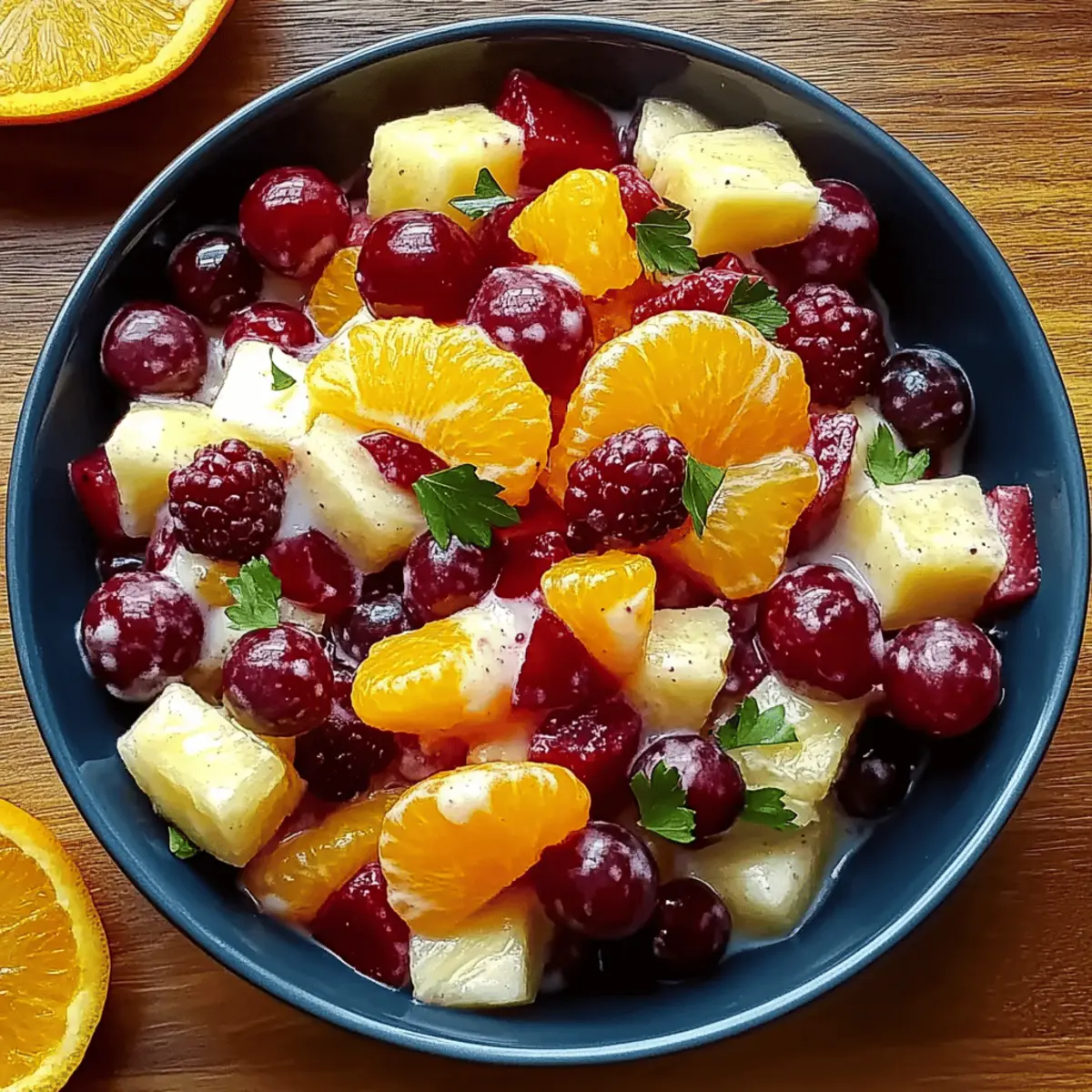 In a large mixing bowl, begin by carefully peeling and segmenting 3 cups of fresh oranges. Add 2 cups of halved grapes, 2 cups of juicy pineapple chunks, and 2 cups of mixed berries, including strawberries, blueberries, and raspberries. Gently toss these vibrant fruits together until well mixed, ensuring you create a colorful and inviting base for your Thanksgiving Fruit Salad.