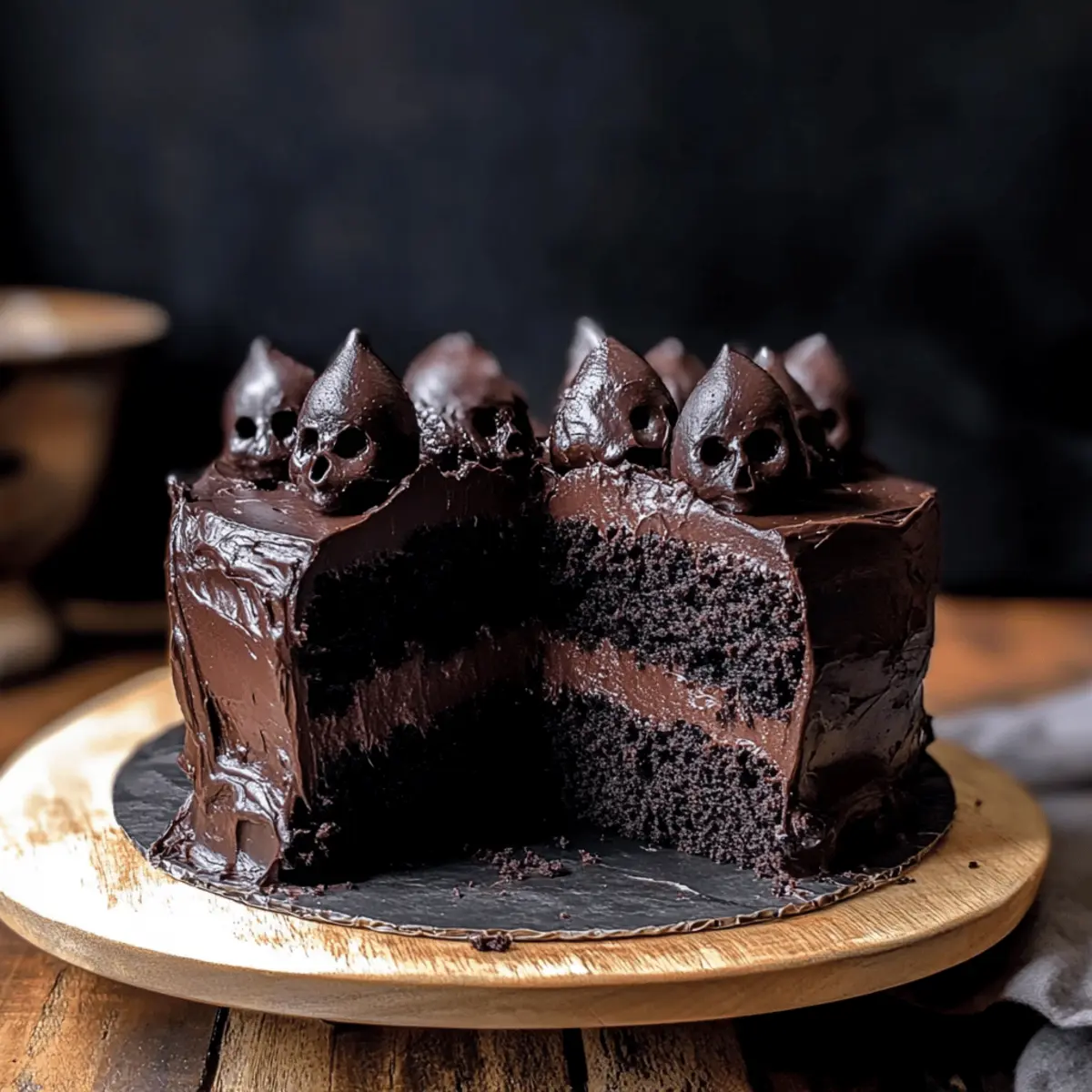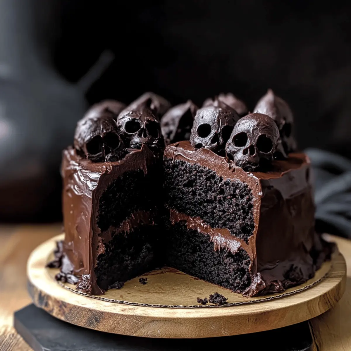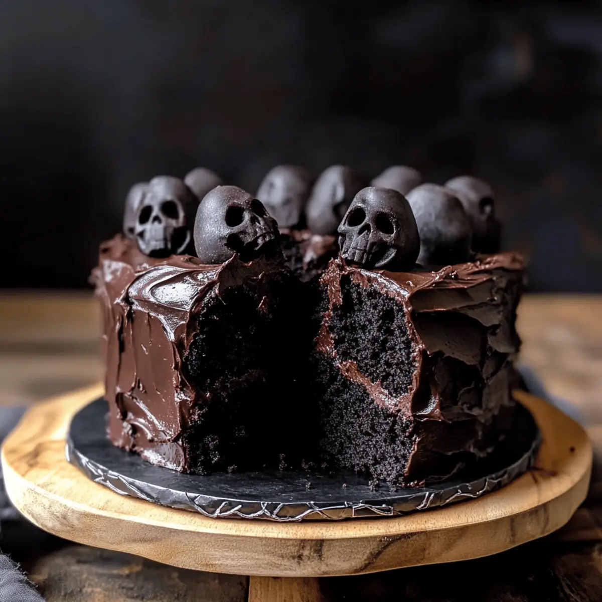 Visually Stunning: With its deep black frosting and spooky chocolate skull decorations, this cake isn’t just delicious—it’s a show-stopper perfect for your Halloween table.