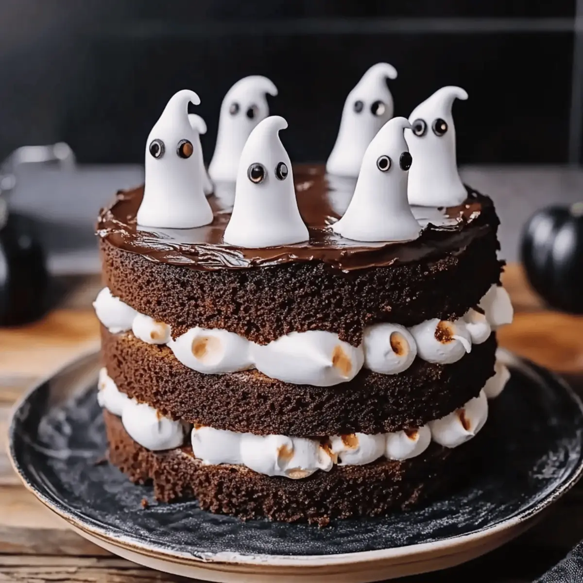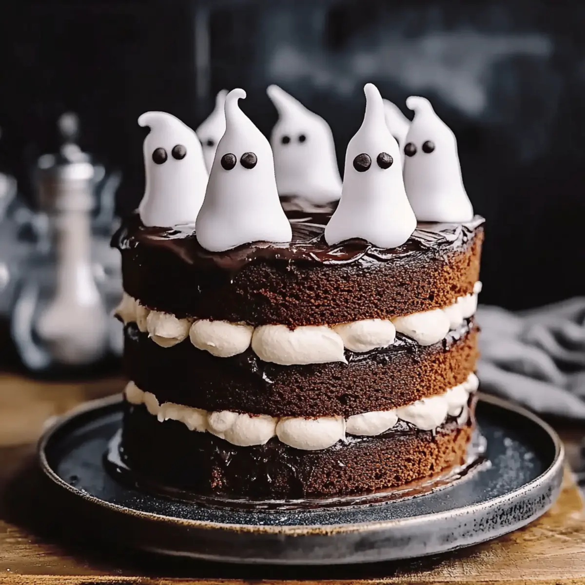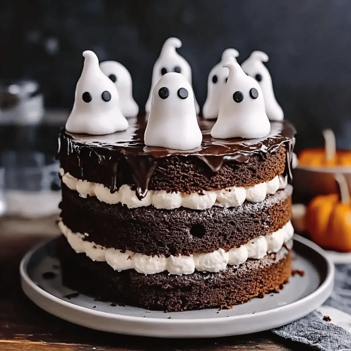 Whimsical Presentation: Edible meringue ghosts give this cake a unique flair, making it the centerpiece for any Halloween gathering.