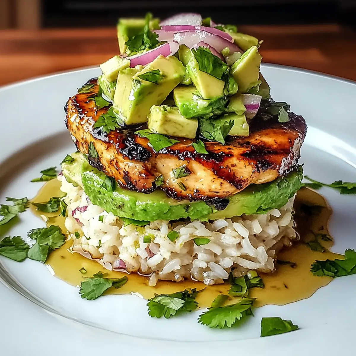 6. Assemble the Stack: Layer rice on a plate, top with sliced chicken, and finish with avocado mixture.