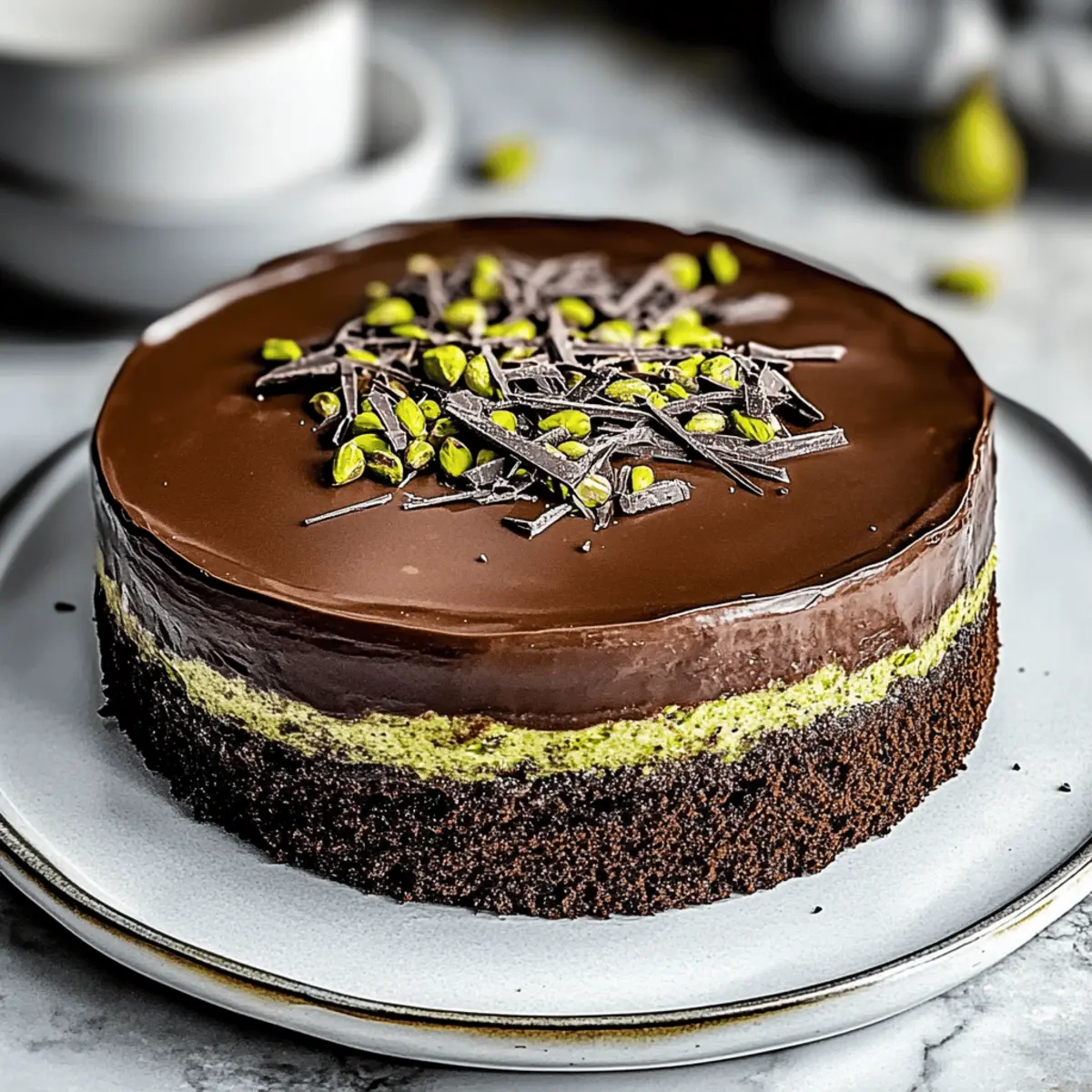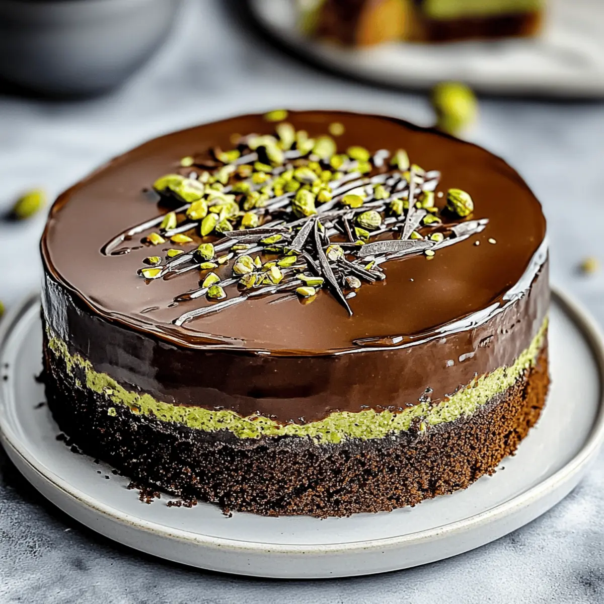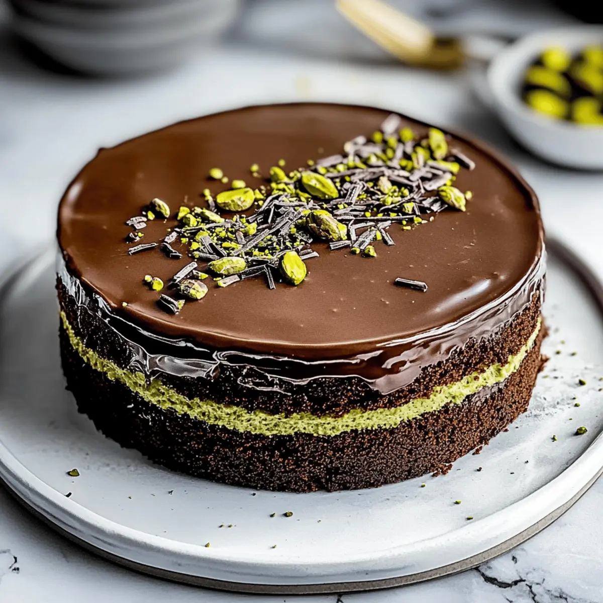 Once the cake has completely cooled, carefully invert it onto a serving platter. Spread the pistachio filling generously over the top, then pour the luscious chocolate sauce evenly over the filling. Use a spatula to smooth it out if needed, allowing the drizzled chocolate to cascade down the sides for an eye-catching presentation.