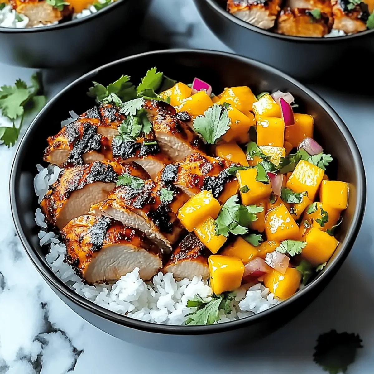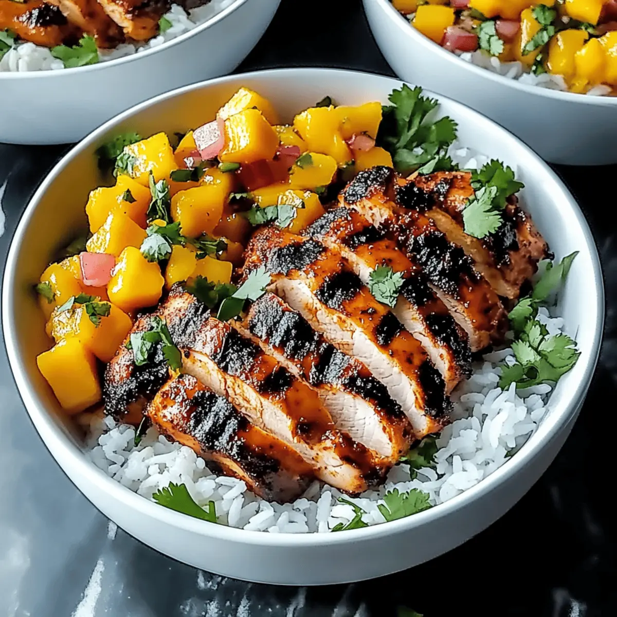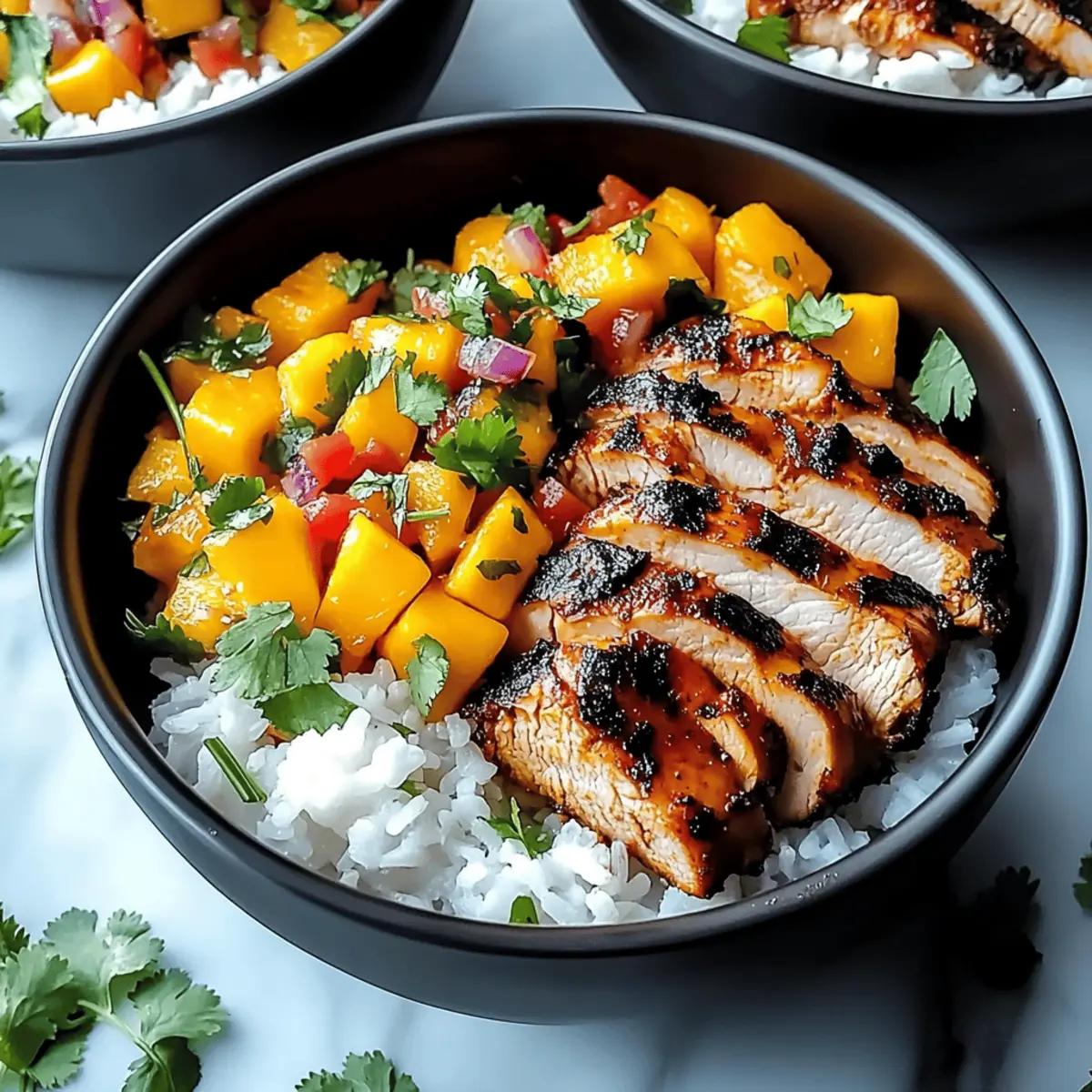 Experience the vibrant flavors of Jerk Chicken Rice Bowls, topped with zesty mango salsa and creamy coconut rice.