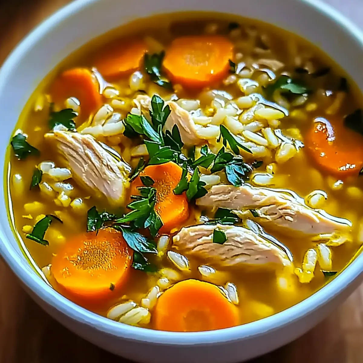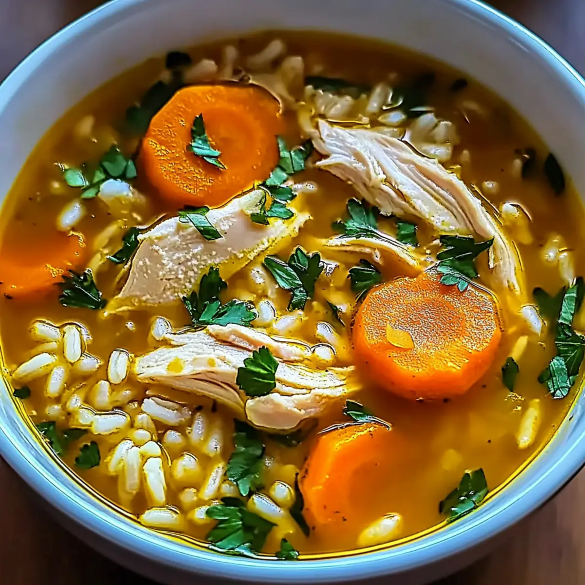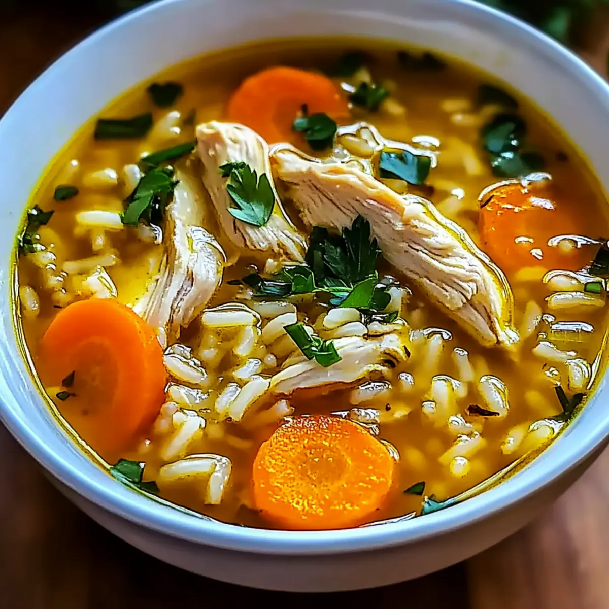 Serve your soup hot, garnished with fresh parsley for a lovely finishing touch. The vibrant green not only adds color but also brightness, making your hearty Lemon Ginger Turmeric Chicken and Rice Soup a delight for the senses.