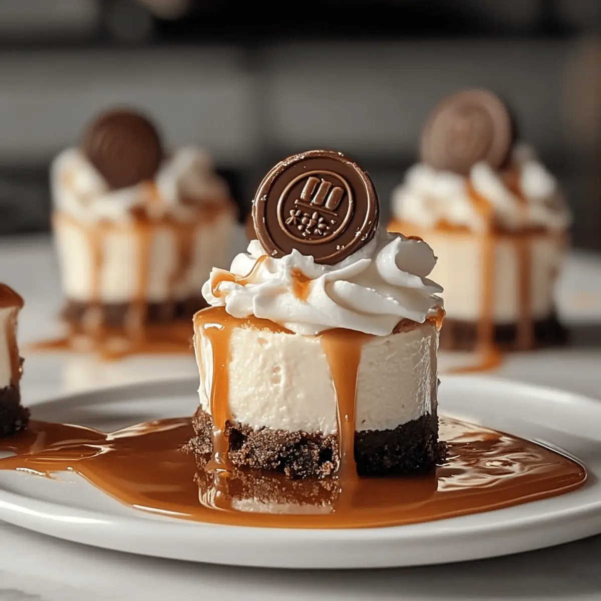 8. Pipe the whipped cream onto the cheesecake bites, drizzle with caramel and chocolate sauce, and place a halved Rolo on top. Chill before serving.