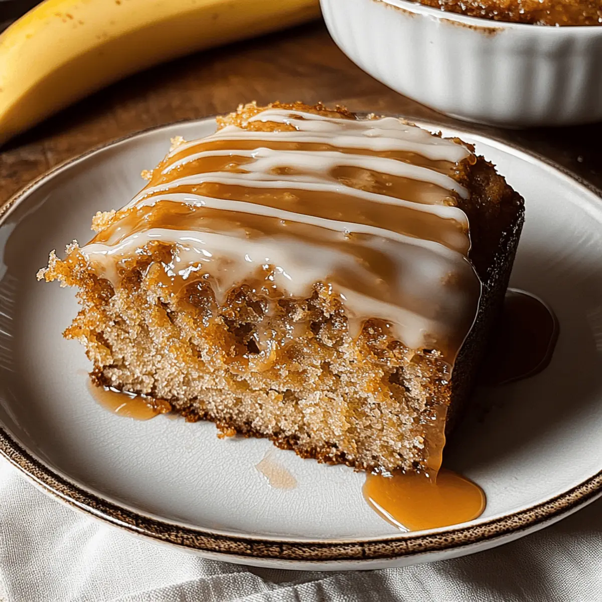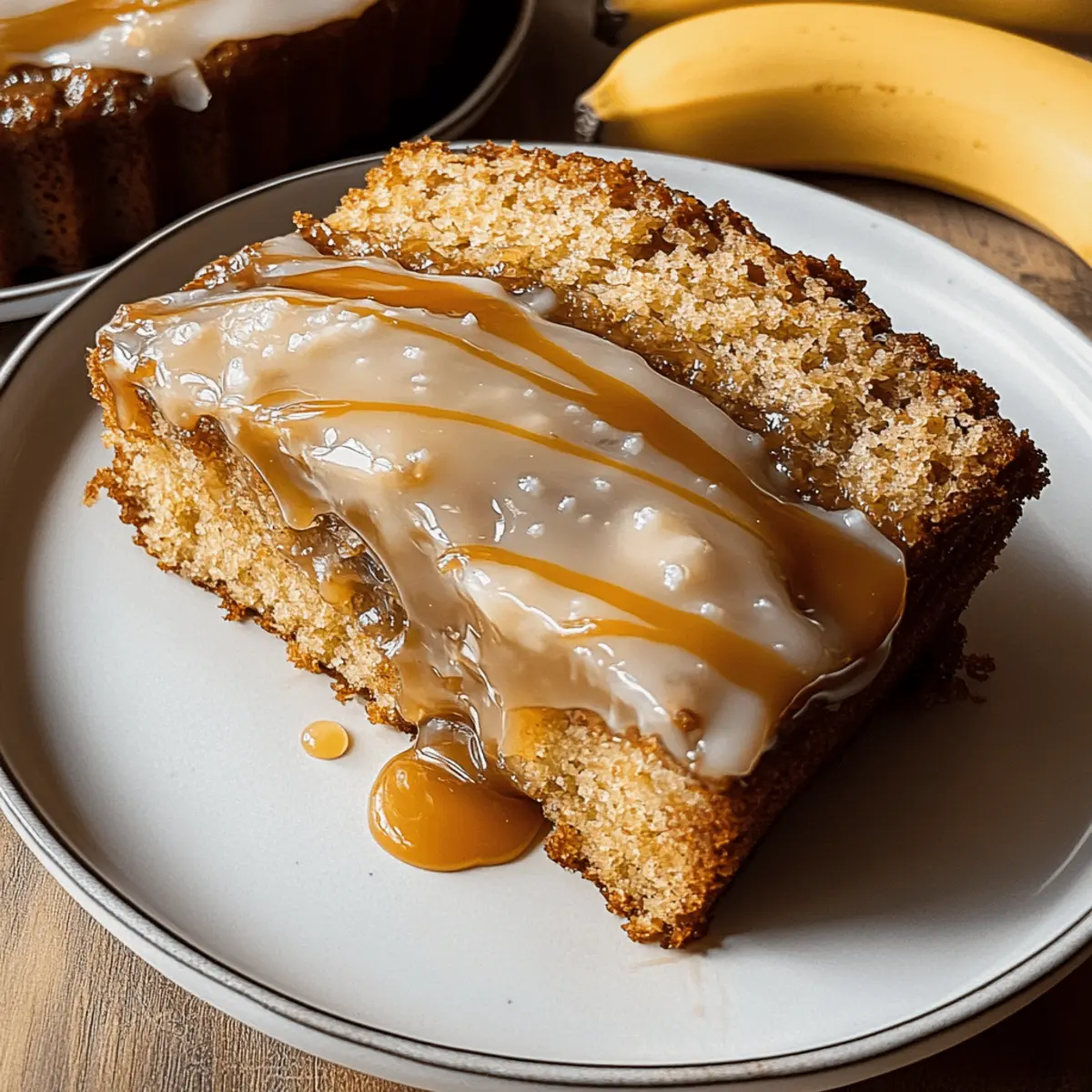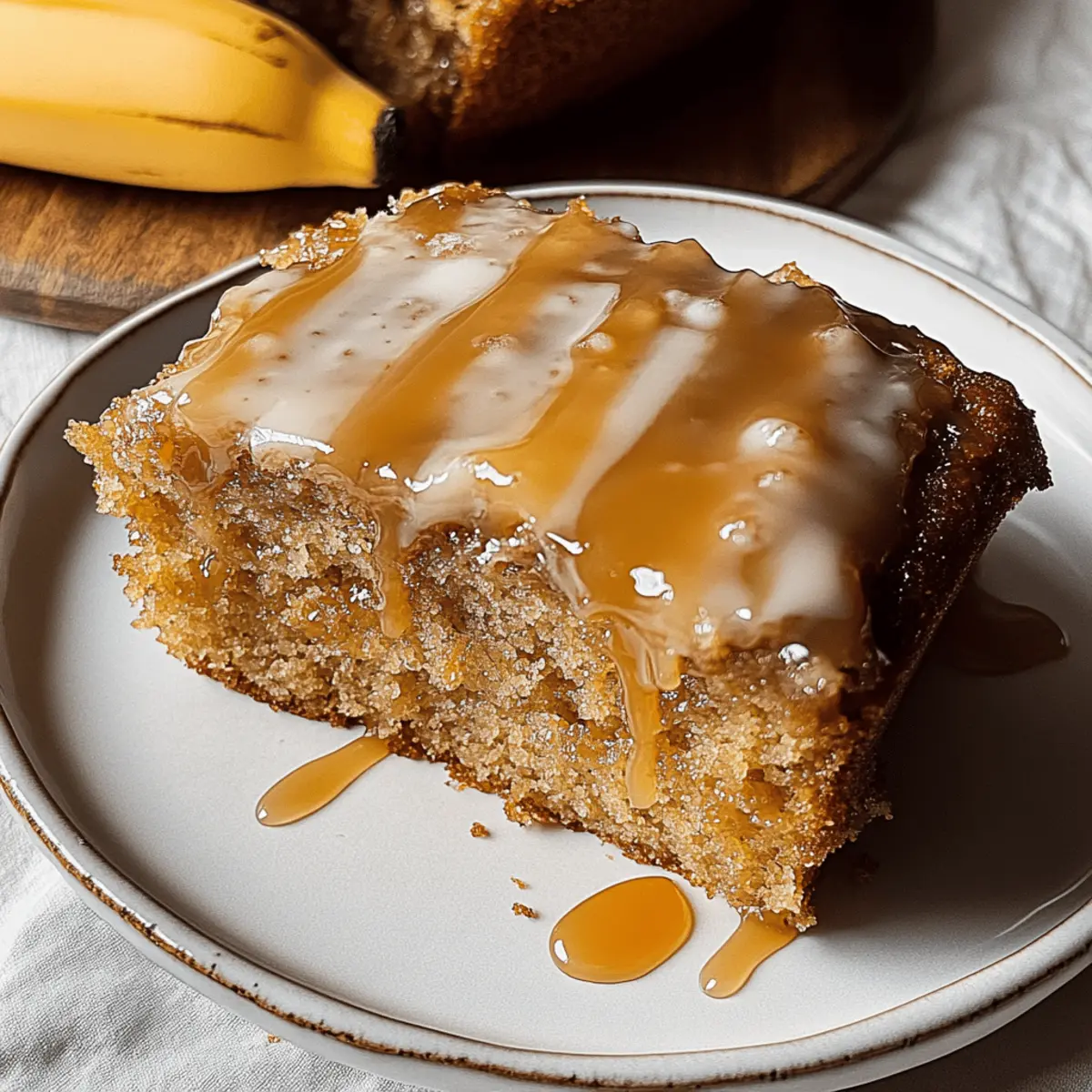- Drizzle the salted caramel over the cooled banana cake and serve.