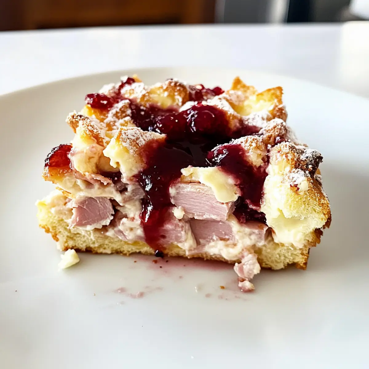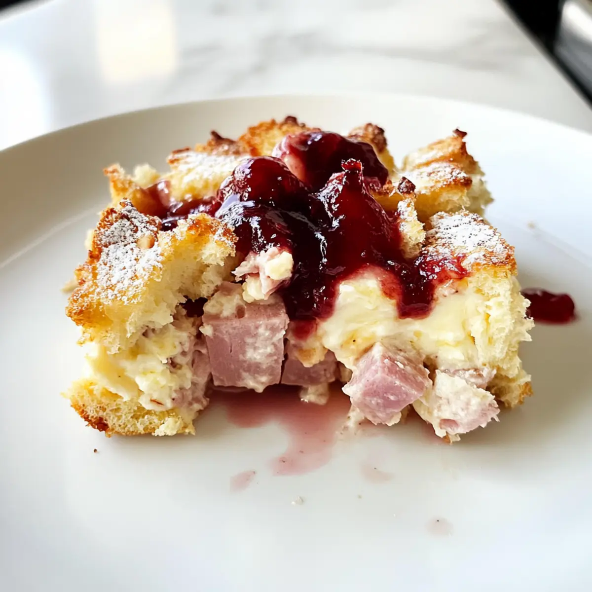 Flavor-Packed: Each bite of this Monte Cristo Breakfast Casserole bursts with a delicious mix of savory ham and gooey cheese, perfectly balanced by sweet raspberry preserves.