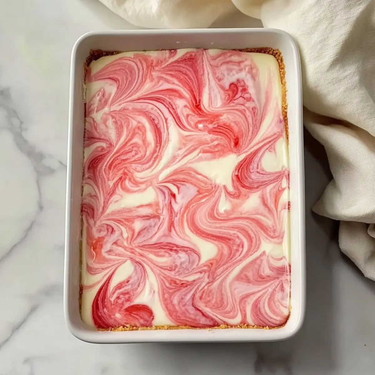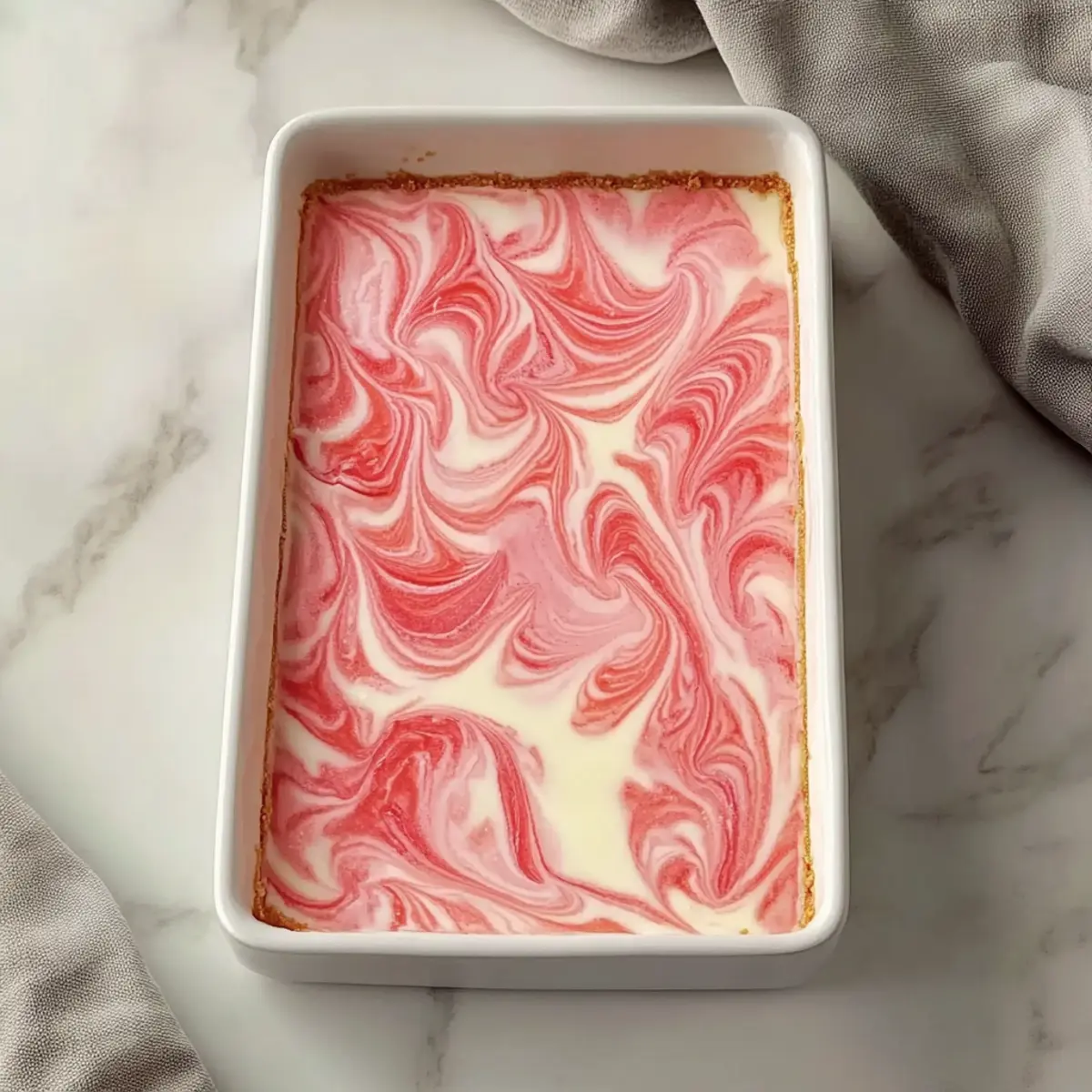 Pour the cheesecake filling over the prepared crust, spreading it evenly with a spatula. Drizzle in any remaining rhubarb puree on top and use a skewer or knife to create beautiful swirls. Cover your baking dish with plastic wrap and refrigerate for a minimum of 3 hours, or until set, allowing the flavors to meld beautifully.
