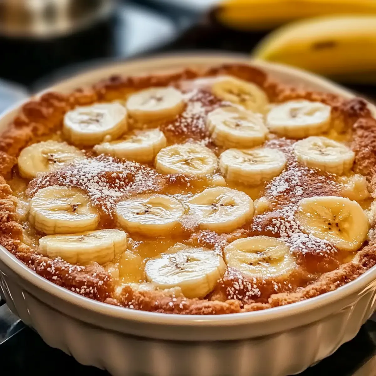 - Pour the batter into the greased baking dish and gently spoon the banana mixture over the top without stirring.