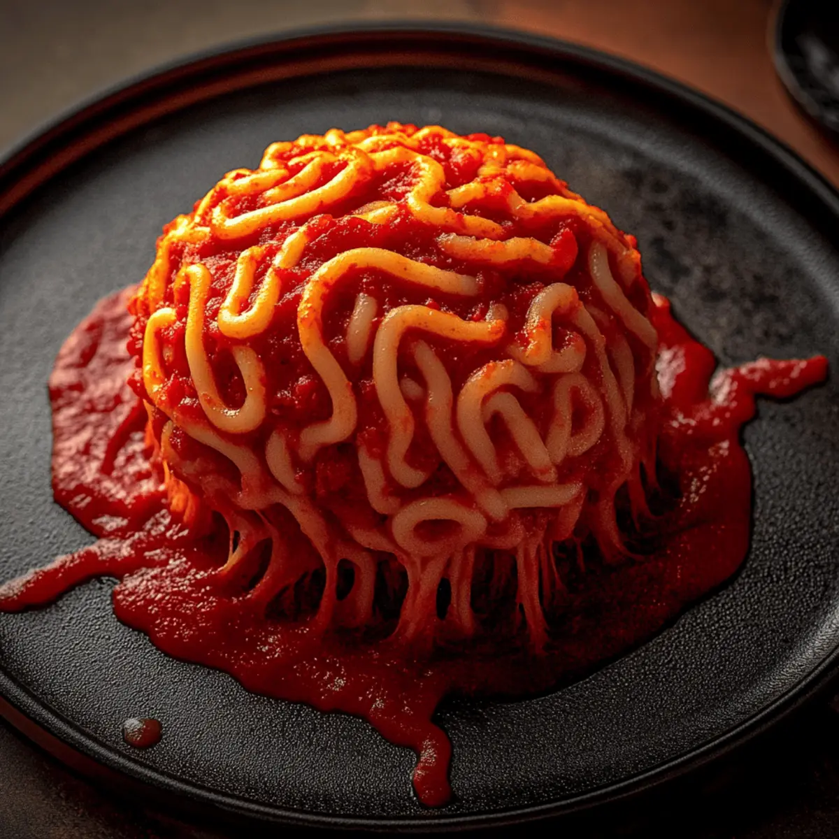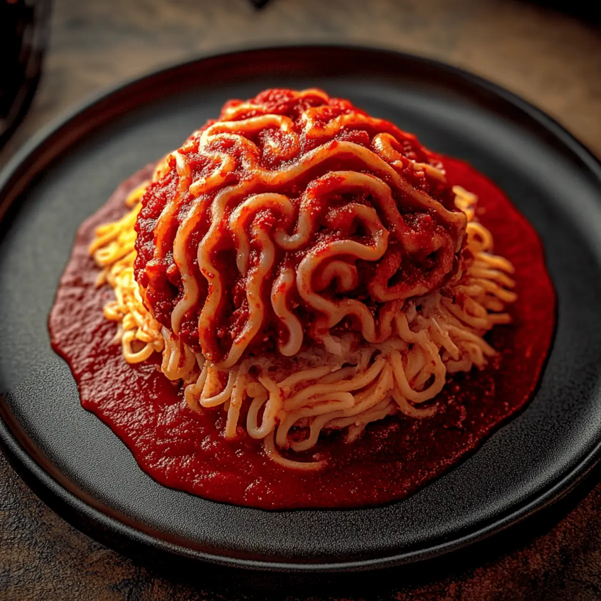 - Preheat oven to 375°F (190°C). Lightly grease a bundt pan and mold the spaghetti mixture into it, creating a brain-like shape.