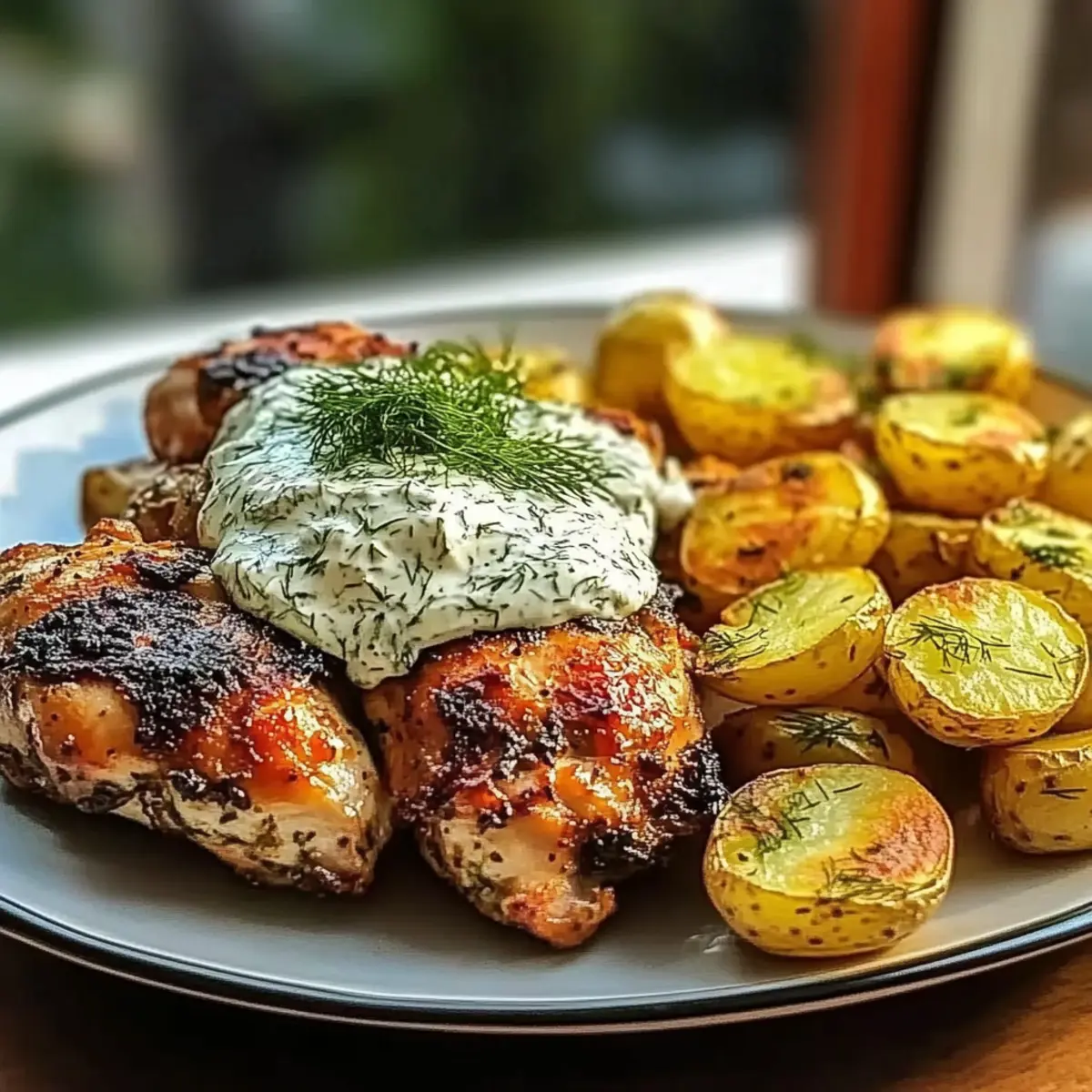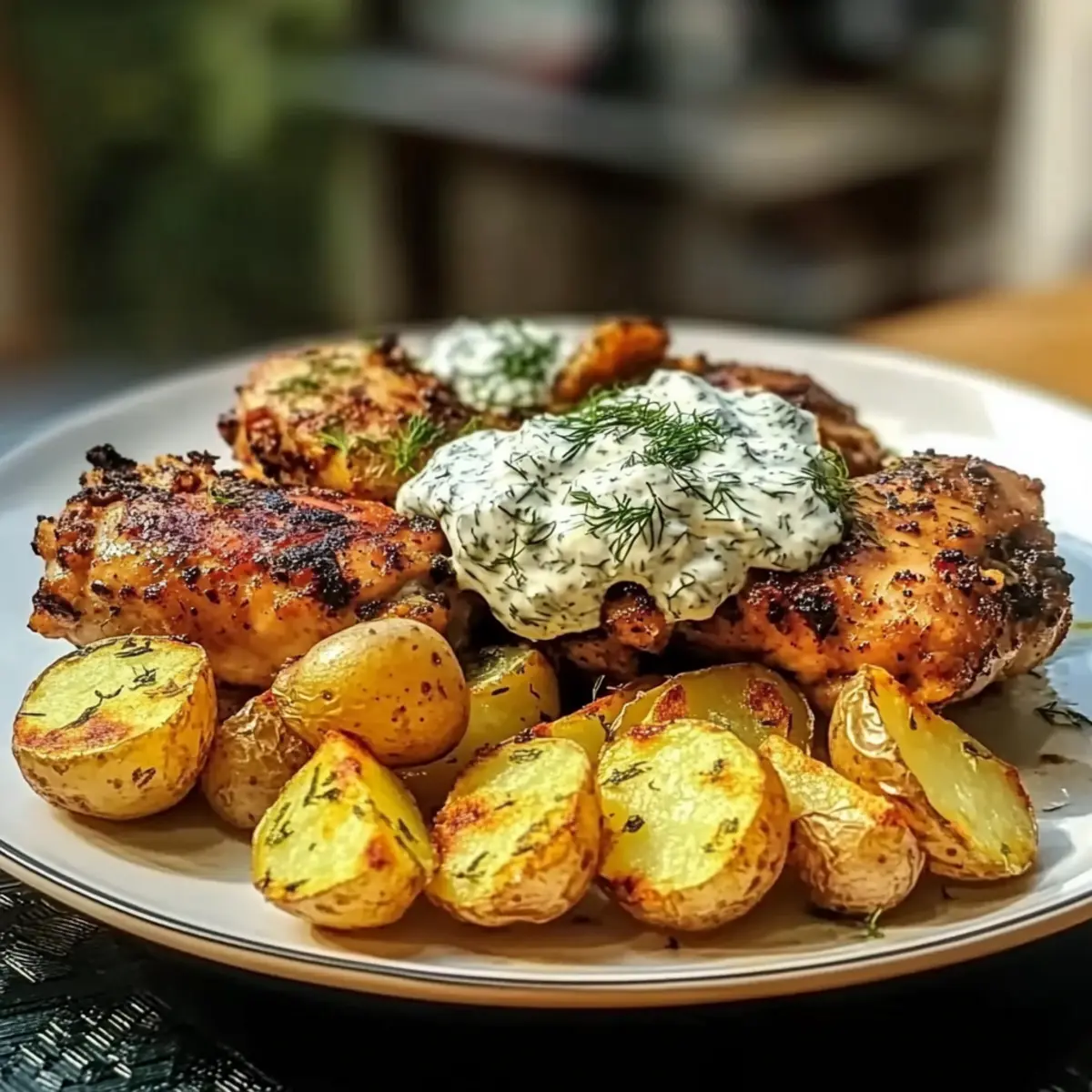 Plate your succulent Spicy Yogurt Marinated Chicken alongside the crispy baby potatoes. Generously drizzle the dill feta cream over the chicken, and consider garnishing with fresh dill or a sprinkle of lemon zest for an extra pop of flavor. Enjoy the delightful marriage of textures and tastes in each bite!
