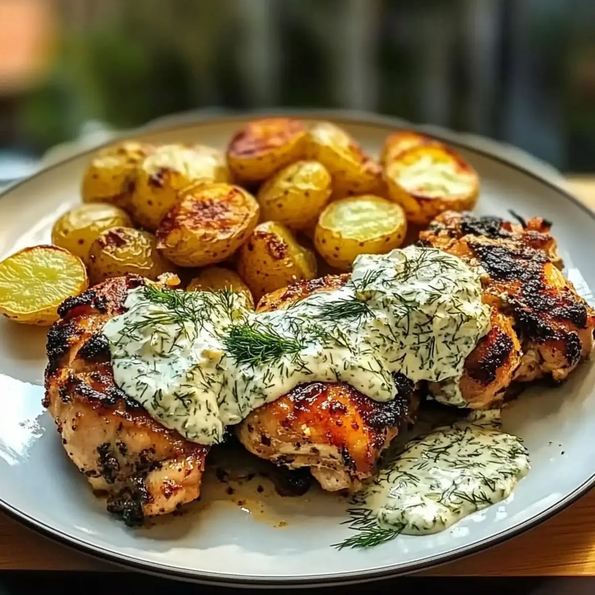 - Plate the chicken with crispy potatoes, drizzle dill feta cream over the chicken, and garnish as desired.