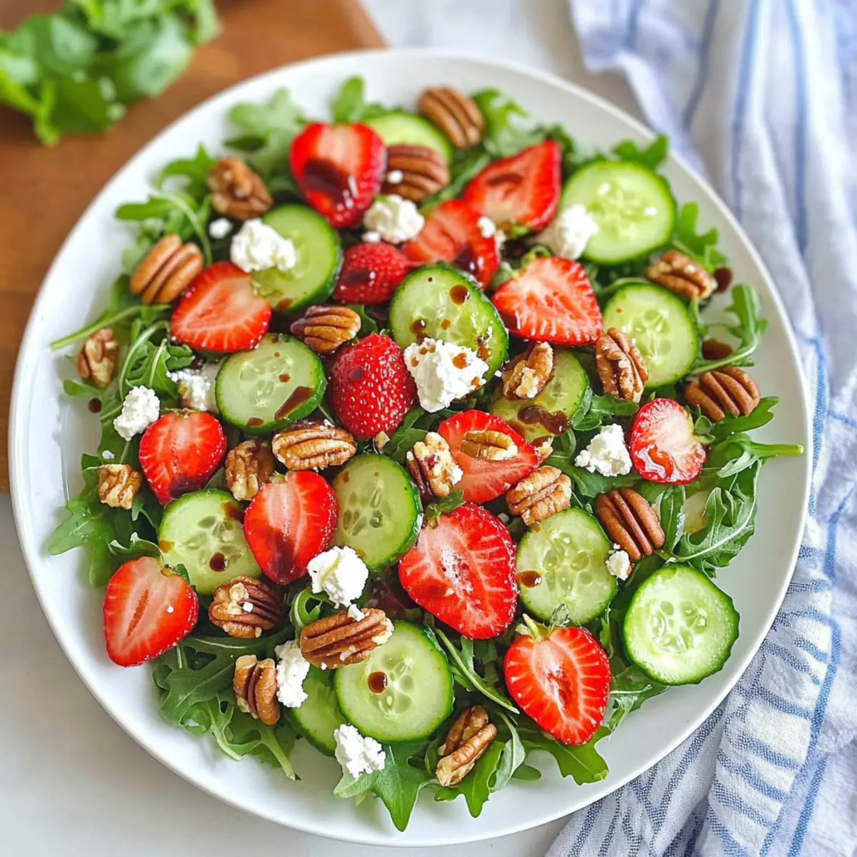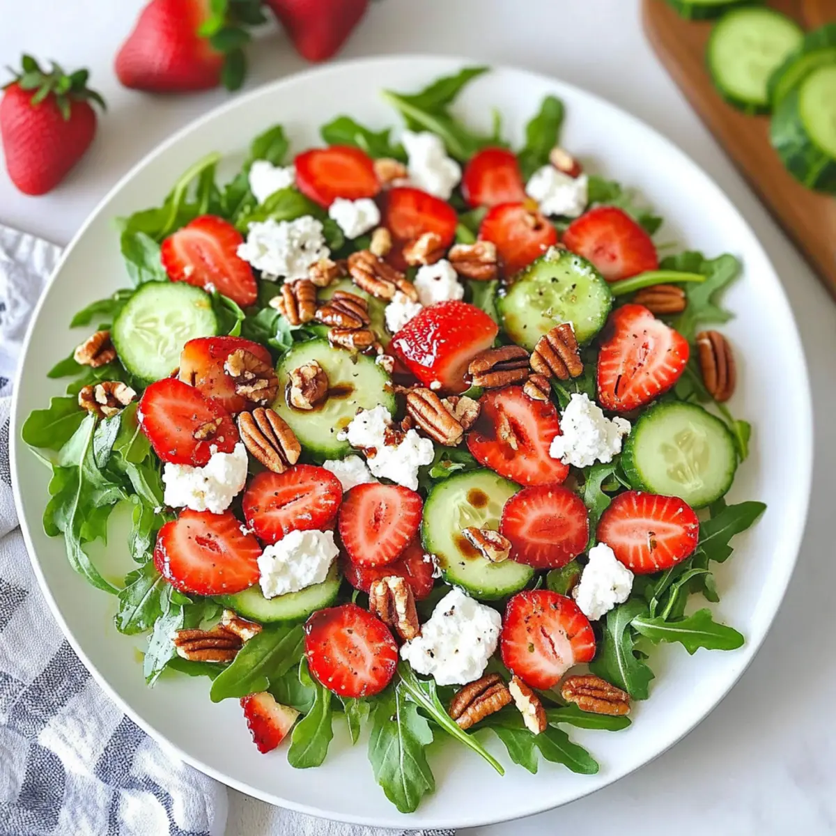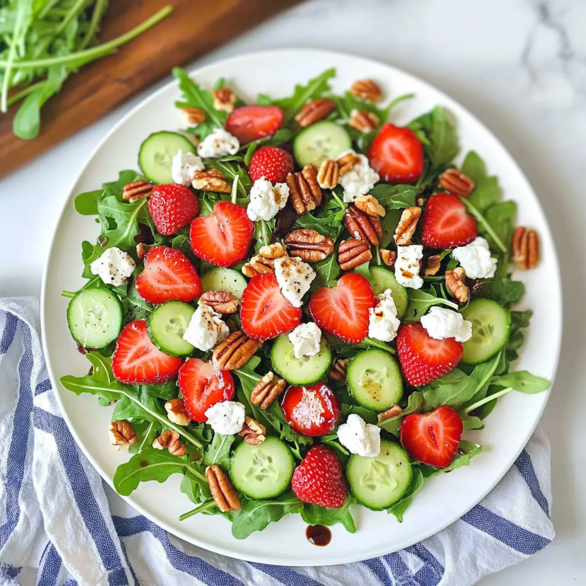 - Preparation: You can prepare the salad components (arugula, strawberries, cucumber, and nuts) a day in advance. Just combine them before serving for a fresh taste.