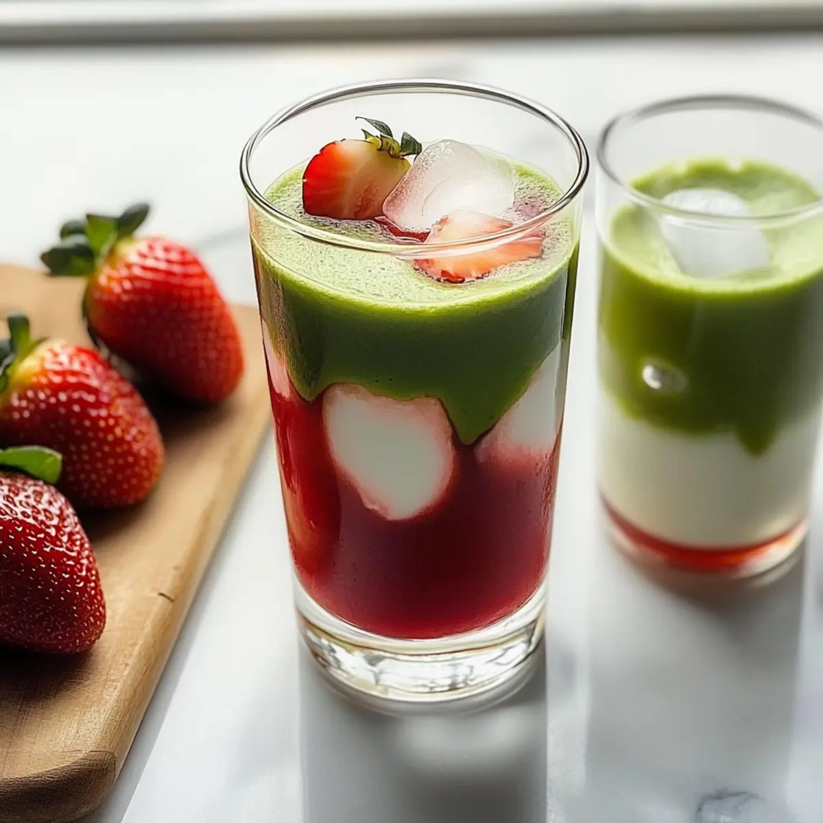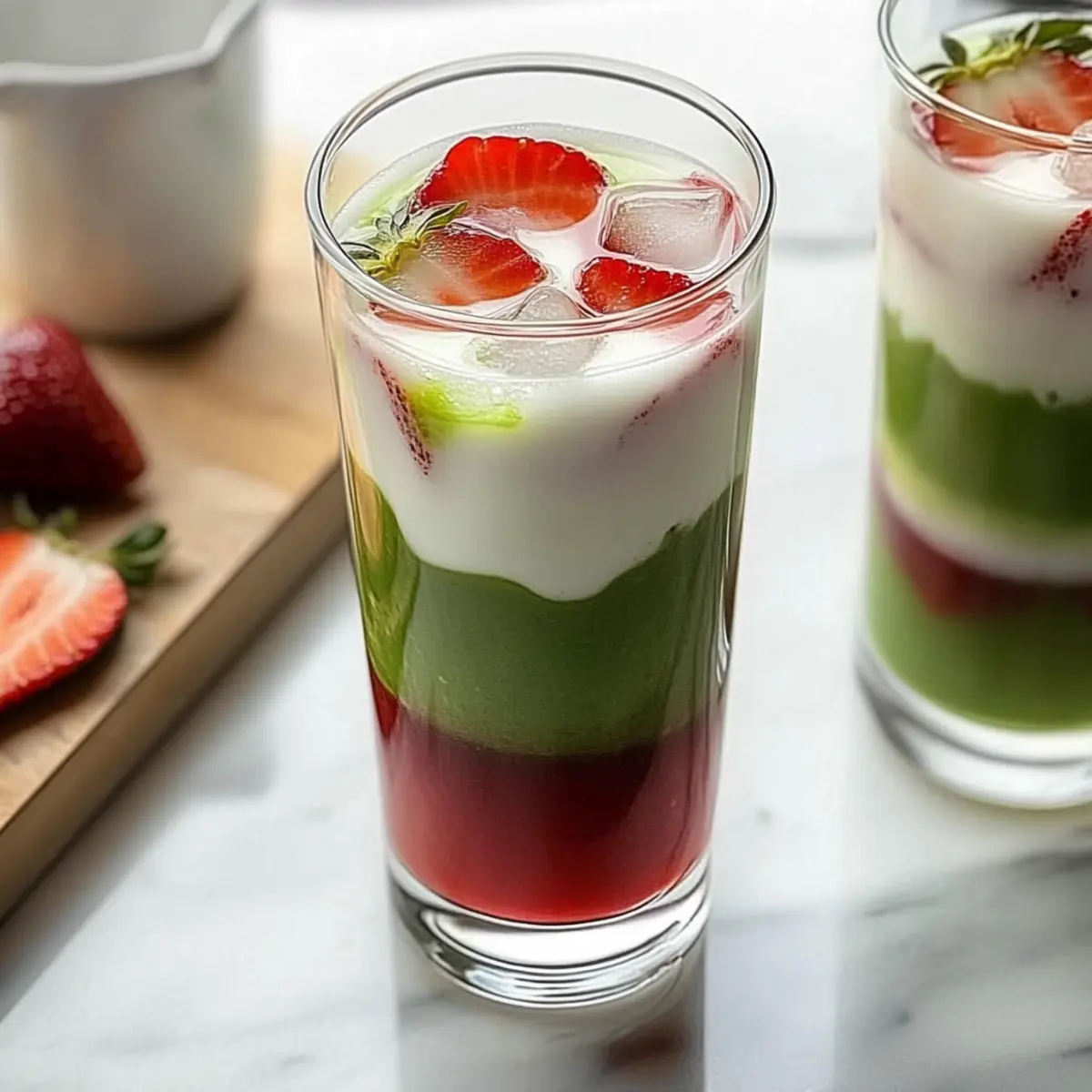 - Carefully spoon the whisked matcha over the milk in each glass, using the back of a spoon to preserve the layers. For a whimsical touch, garnish with slices of fresh strawberries and an optional drizzle of extra strawberry syrup on top.