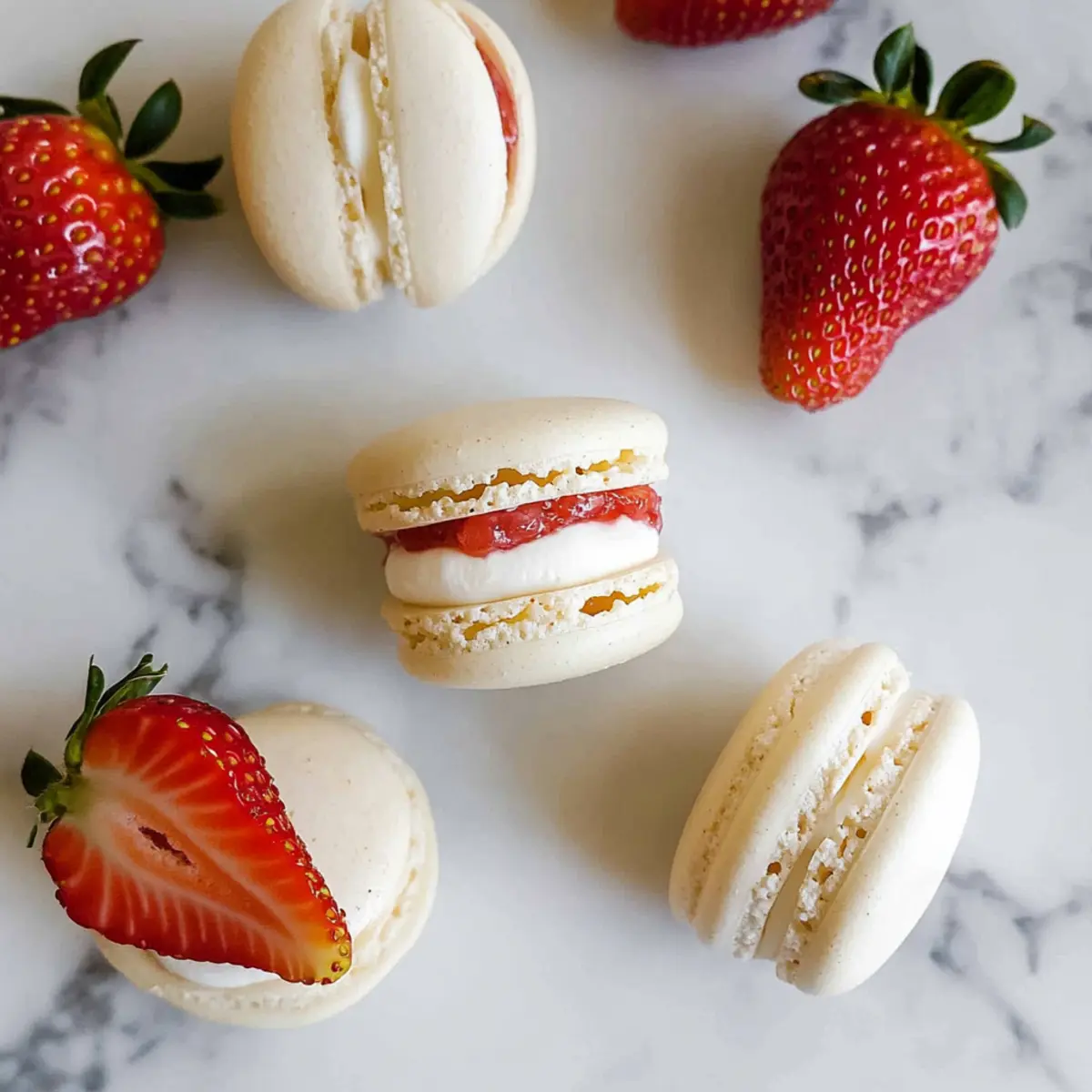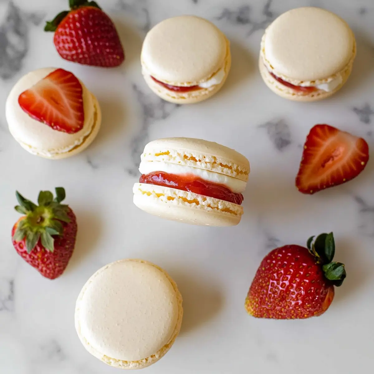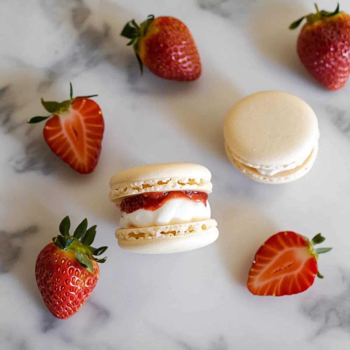- Assemble the Macarons: Pair macaron shells, pipe cream filling, add strawberry jam and a slice of fresh strawberry, then sandwich.