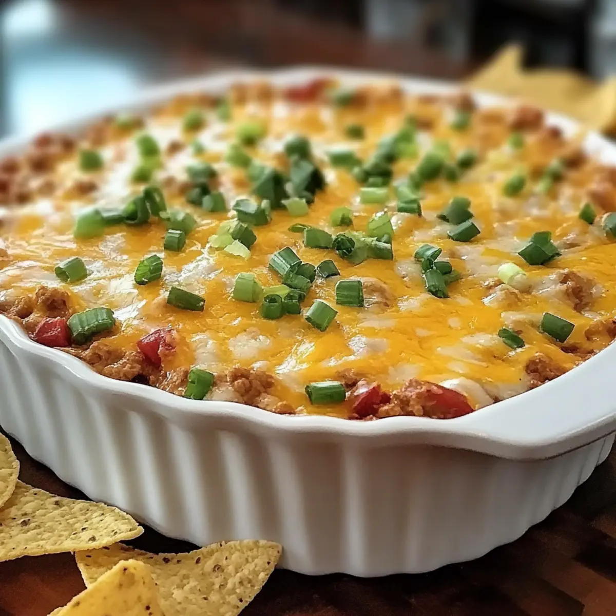 Once baked, remove the dip from the oven and let it cool for a few minutes. Before serving, garnish the top with the remaining sliced green onions for a fresh pop of color. Your Texas Trash Dip is now ready to be scooped up with tortilla chips or veggies, bringing a cheesy delight to your gathering!