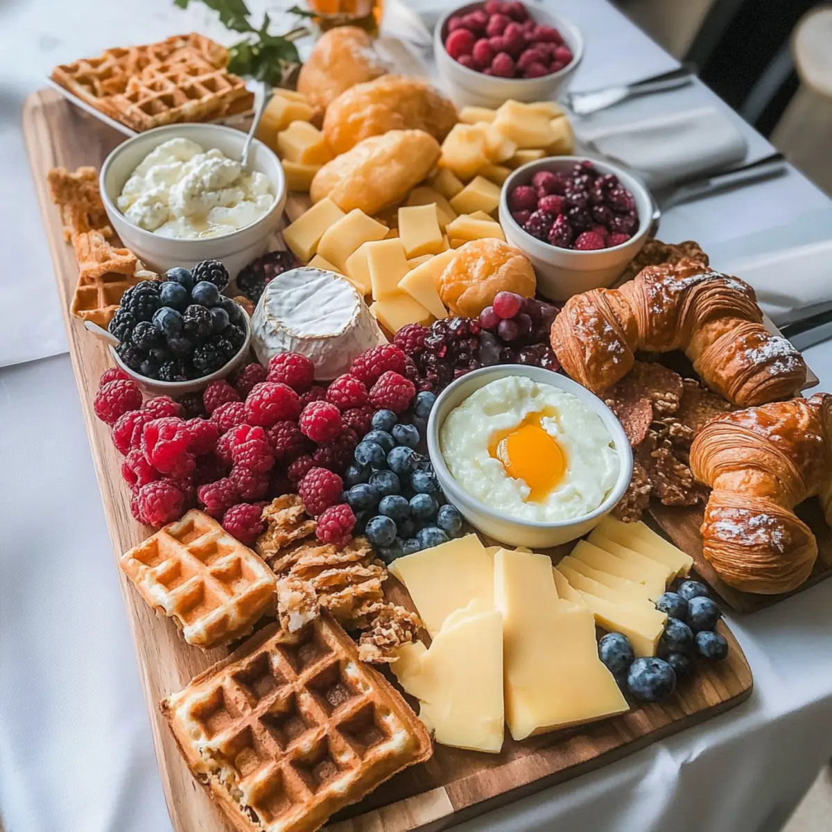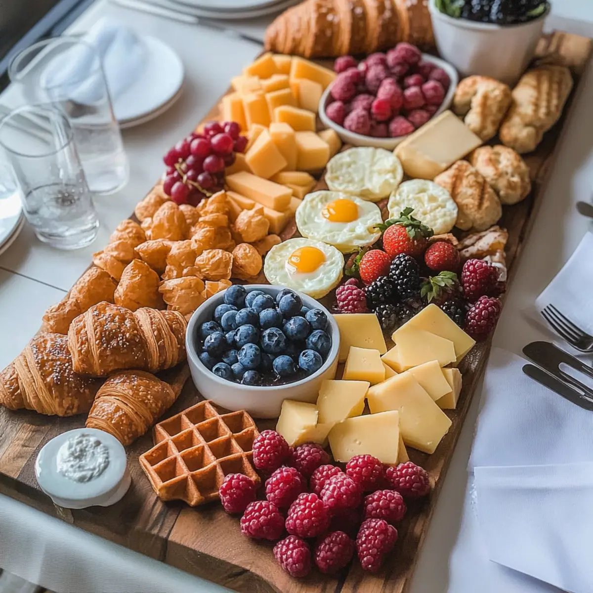 Now, fill gaps on your board with fresh berries; place strawberries, blueberries, and raspberries in a delightful display. Aim for a vibrant color palette that contrasts with the whites and yellows of cheese and eggs — fresh fruits not only add sweetness but also brighten your Classic Brunch Board.