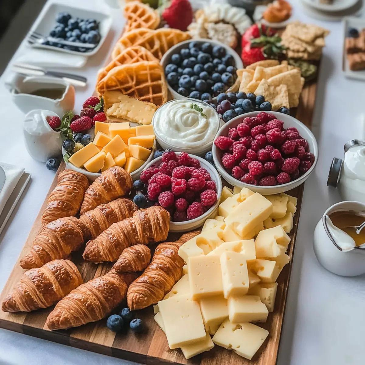 Start by selecting a large wooden board or platter as the foundation for your Classic Brunch Board. Lay out the croissants in a visually appealing arrangement, showcasing their golden, flaky layers. This will serve as your focal point, inviting guests to dive into the buttery goodness right away.