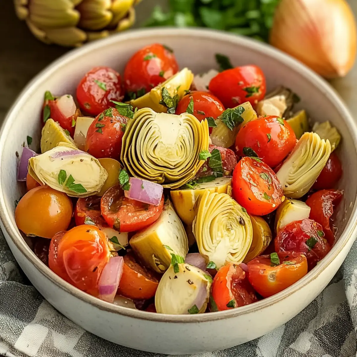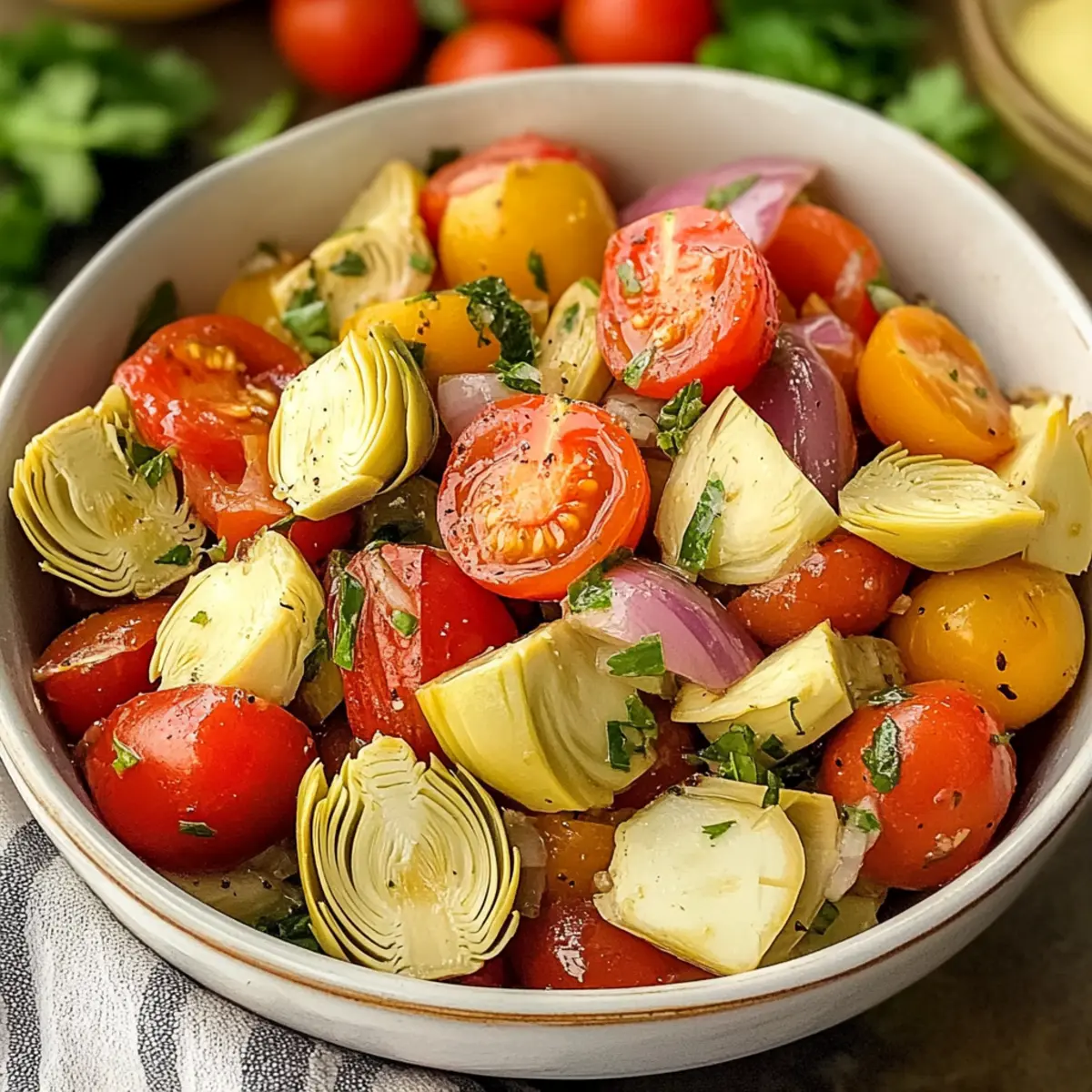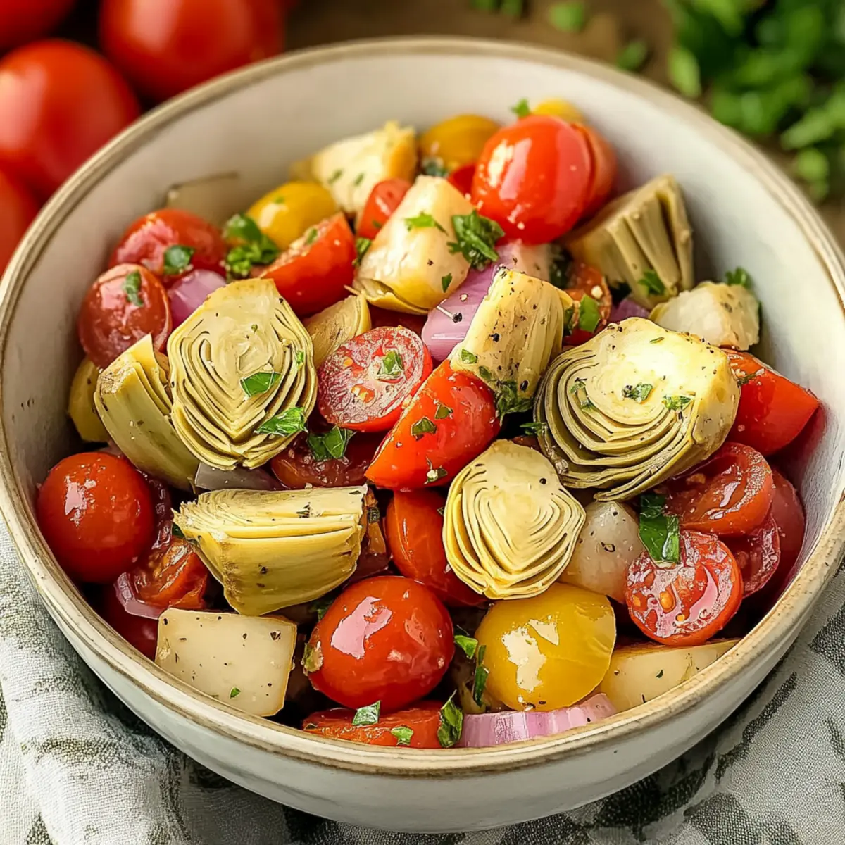 Vibrant Flavors: Each bite of this salad marries the juicy sweetness of cherry tomatoes with the tangy zest of marinated artichokes, creating a refreshing experience.
