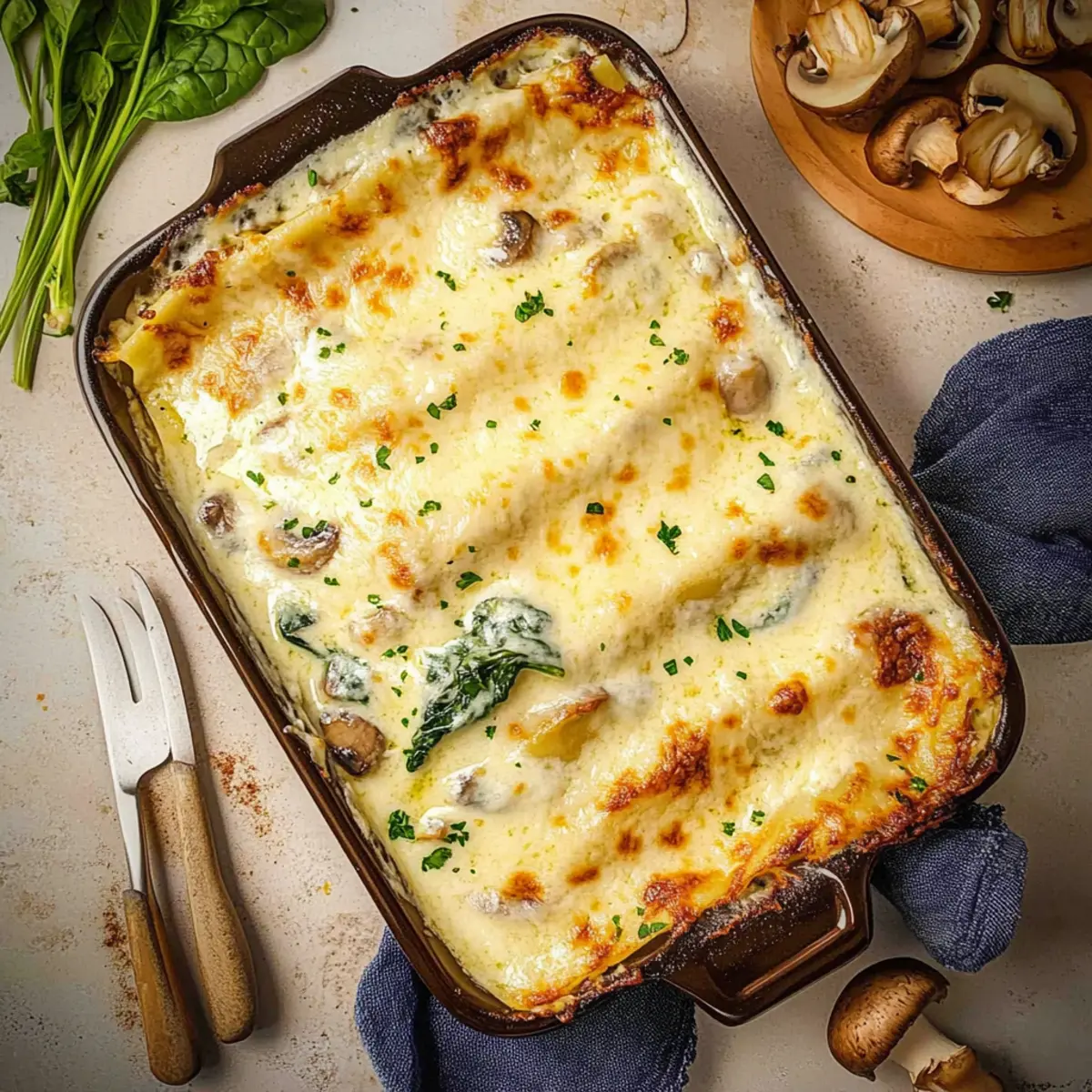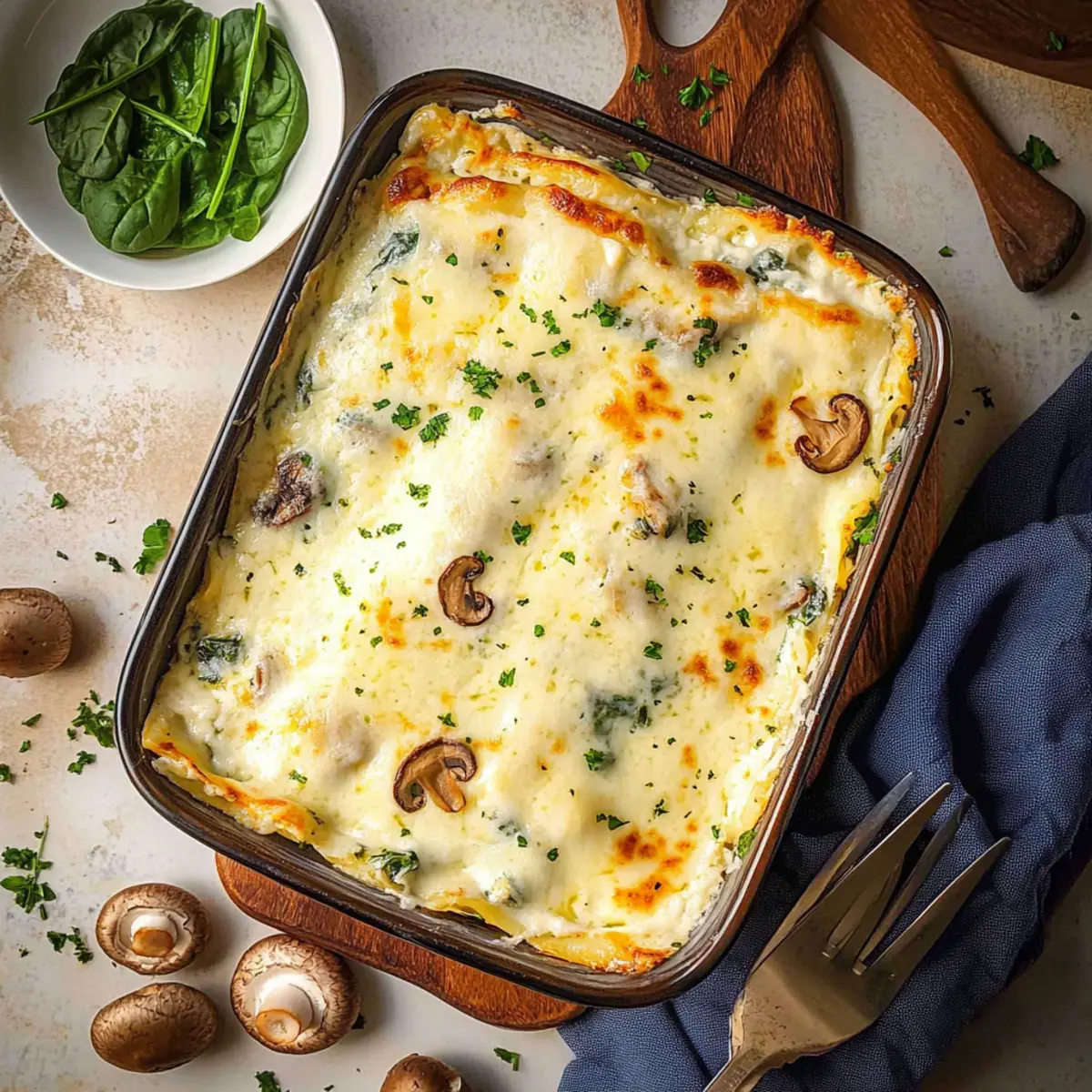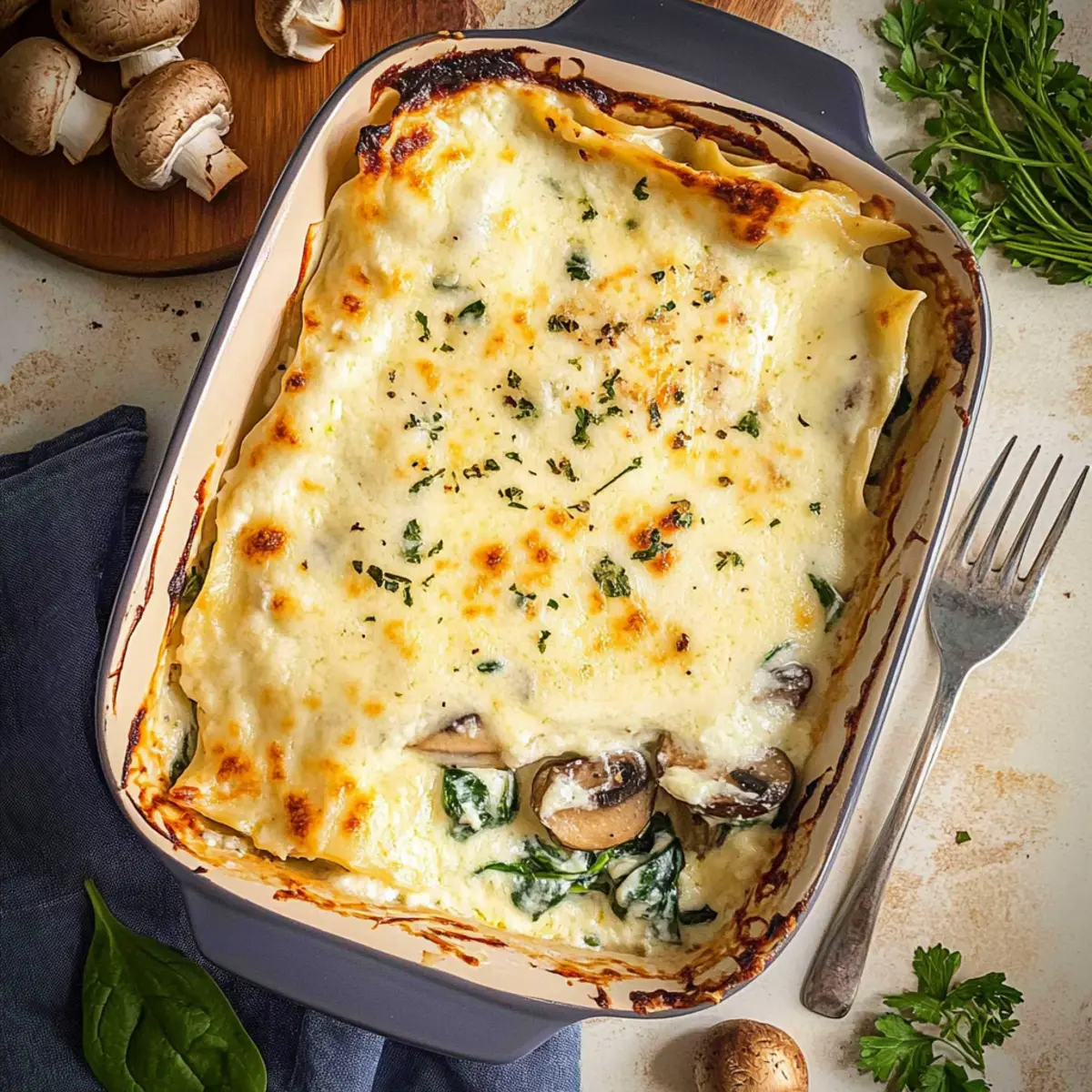 Unforgettable flavors: This creamy white lasagna melds fresh spinach and earthy mushrooms with a rich béchamel, delivering a taste that’s both comforting and sophisticated.
